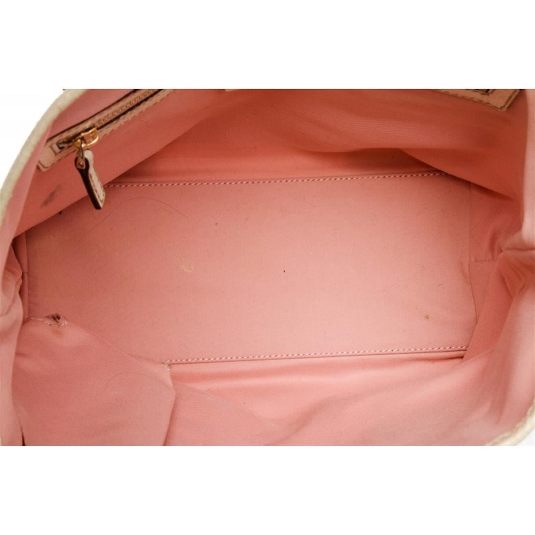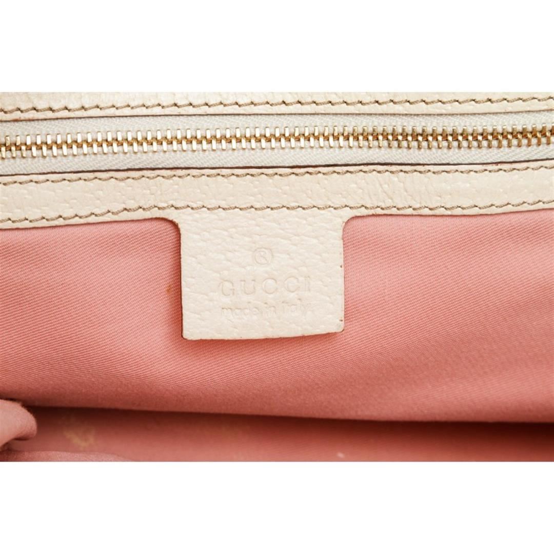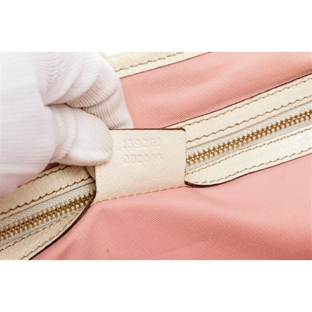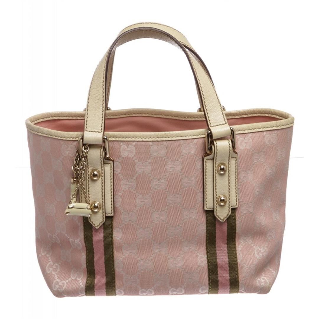 Pink and white canvas Gucci Small Jolicoeur tote with gold-tone hardware, dual flat top handles with bag charm detail, leather trim, Gucci Web trim at exterior, pink woven lining, dual pockets at interior walls; one with zip closure and open at top.