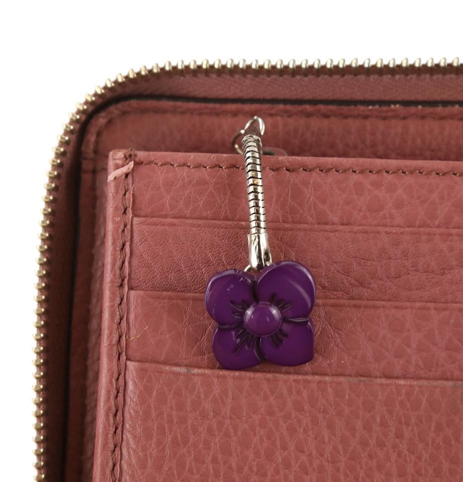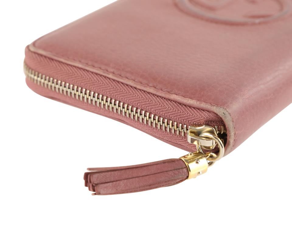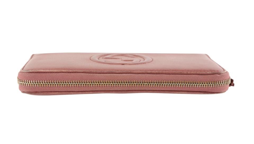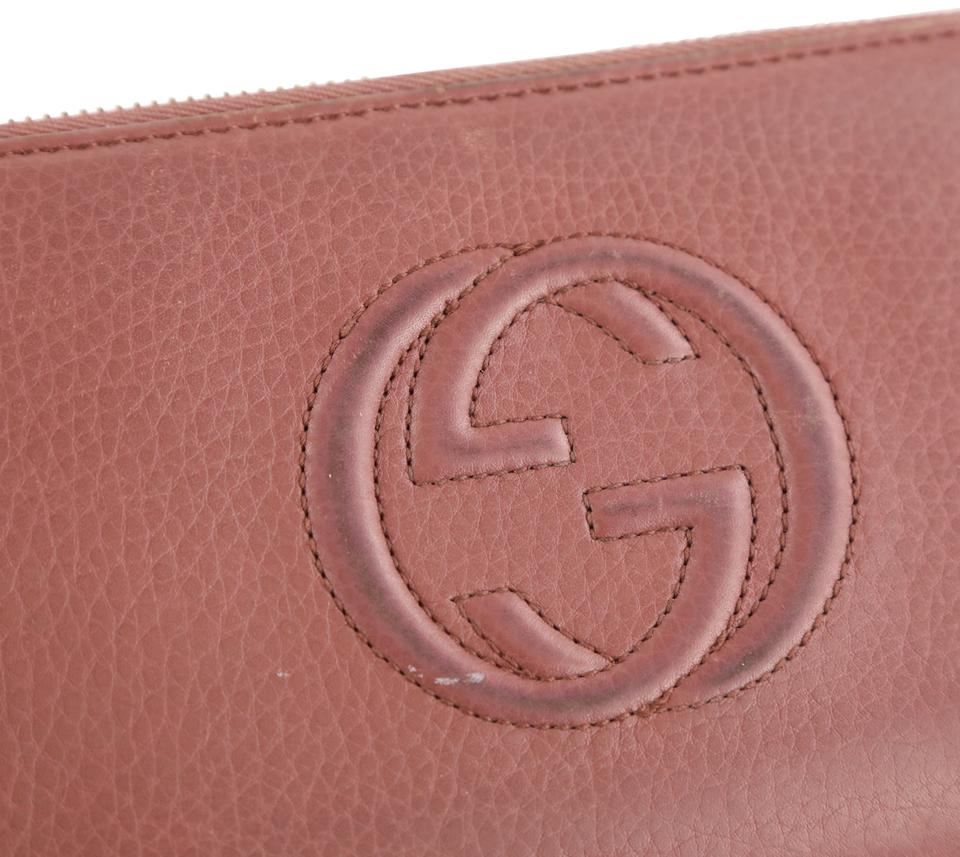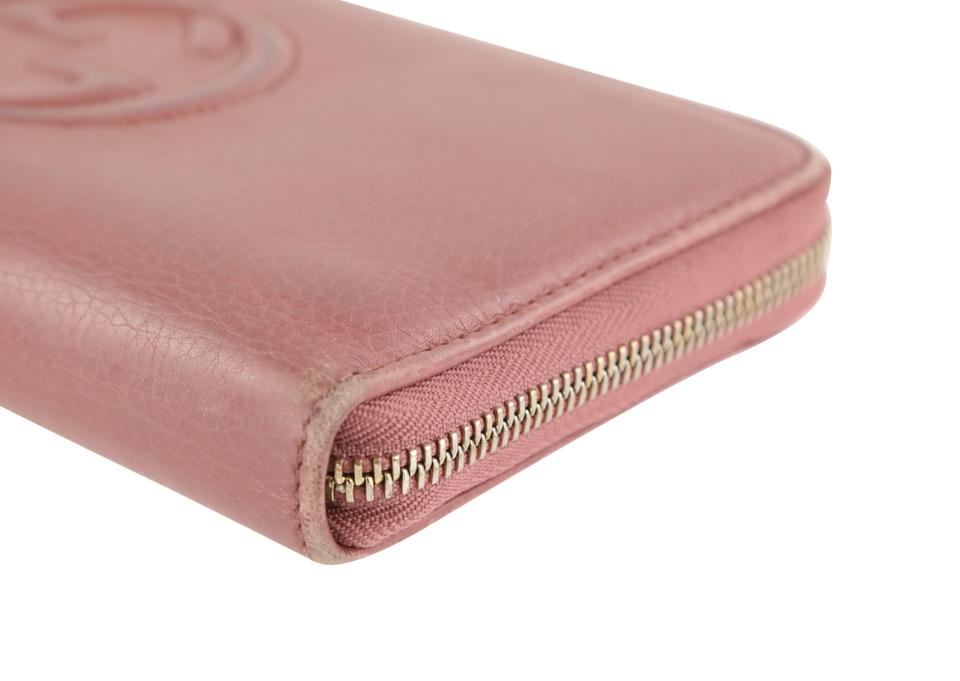 Gucci Soho Zip Around Continental Wallet Zip-around closure Pale gold-tone hardware Pink/Mauve grain leather Card count: 16 Large bill slots: 4 Interior coin zip pocket Made in Italy