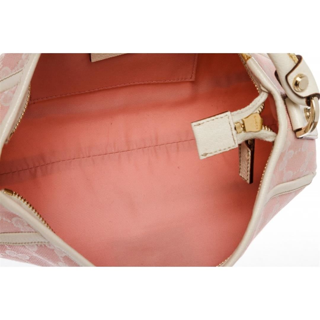 White and pink monogram canvas and leather Gucci Abbey Small Shoulder bag with white leather trim, gold-tone hardware, pink woven interior lining, single pocket at interior wall and zip closure at top. Item is pre-owned.