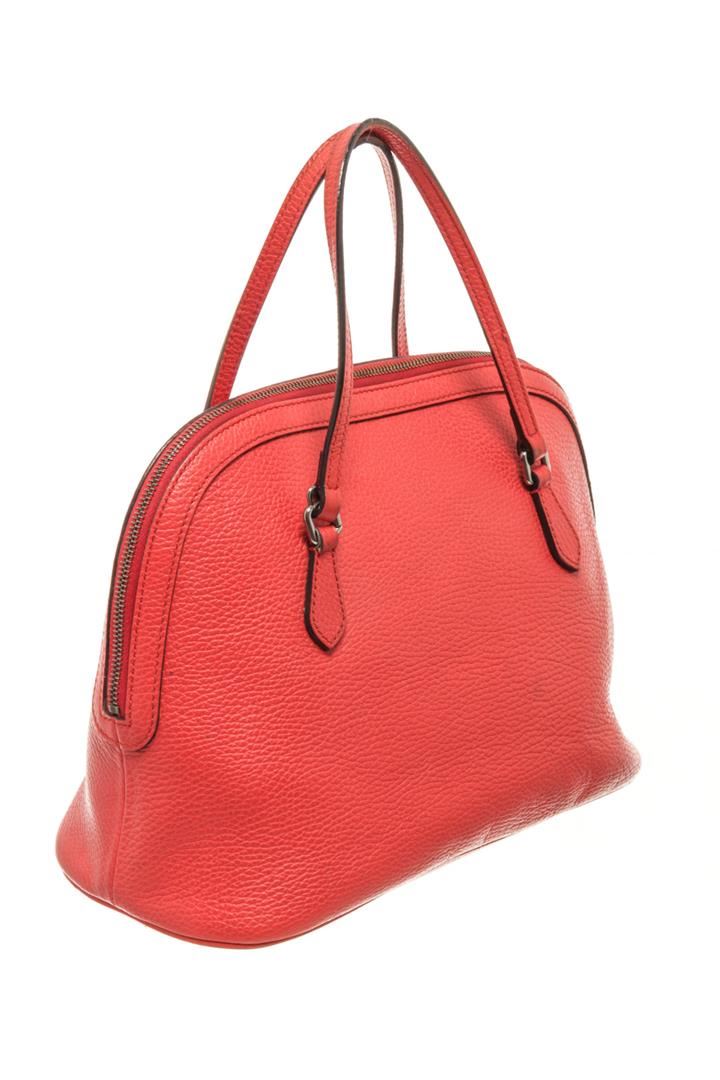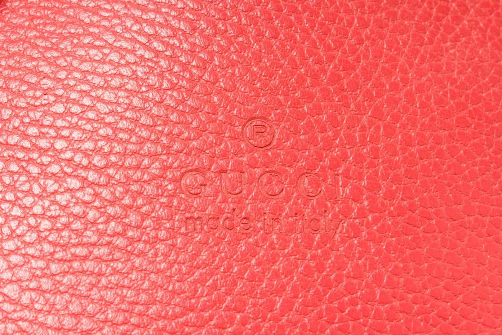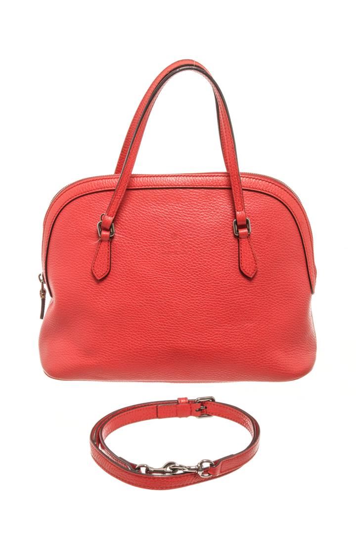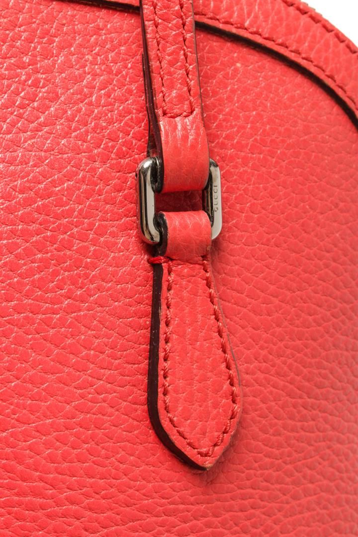 One Gucci Red Calfskin Mini Dome 2 Way Shoulder Bag. Item is sold AS-IS. All available information is listed in the description and shown in the photo. Gucci Red Calfskin Mini Dome 2 Way Shoulder Bag with leather handles, an optional shoulder strap and silver hardware. the zipper opens to a spacious dark brown fabric interior with a patch pocket. Length: 9.25 in, Width: 4.75 in, Height: 7.25 in / 23.49 x 12.06 x 18.41