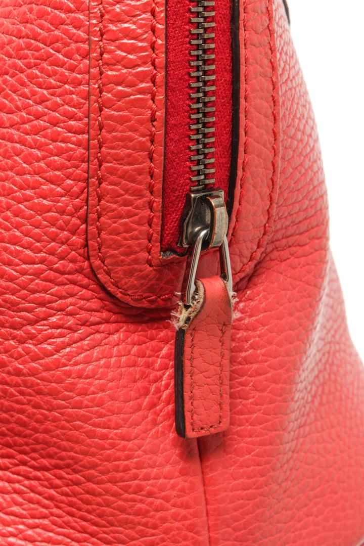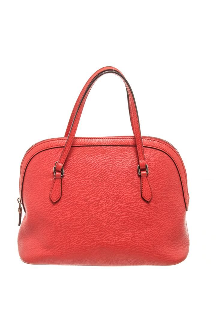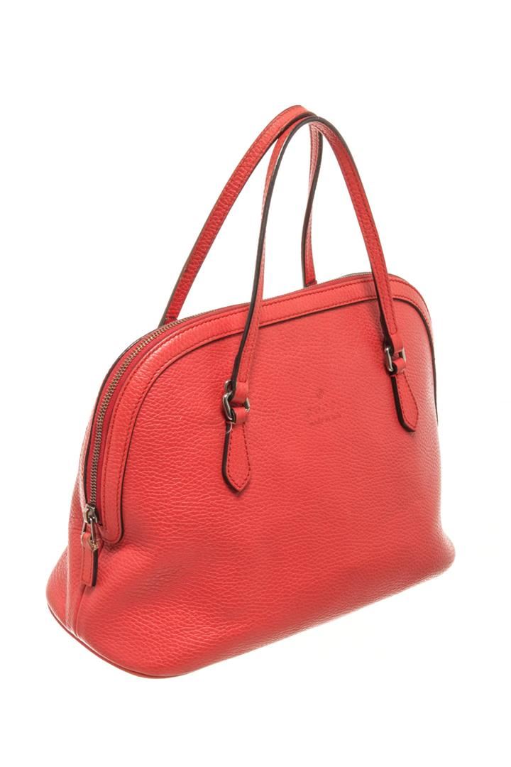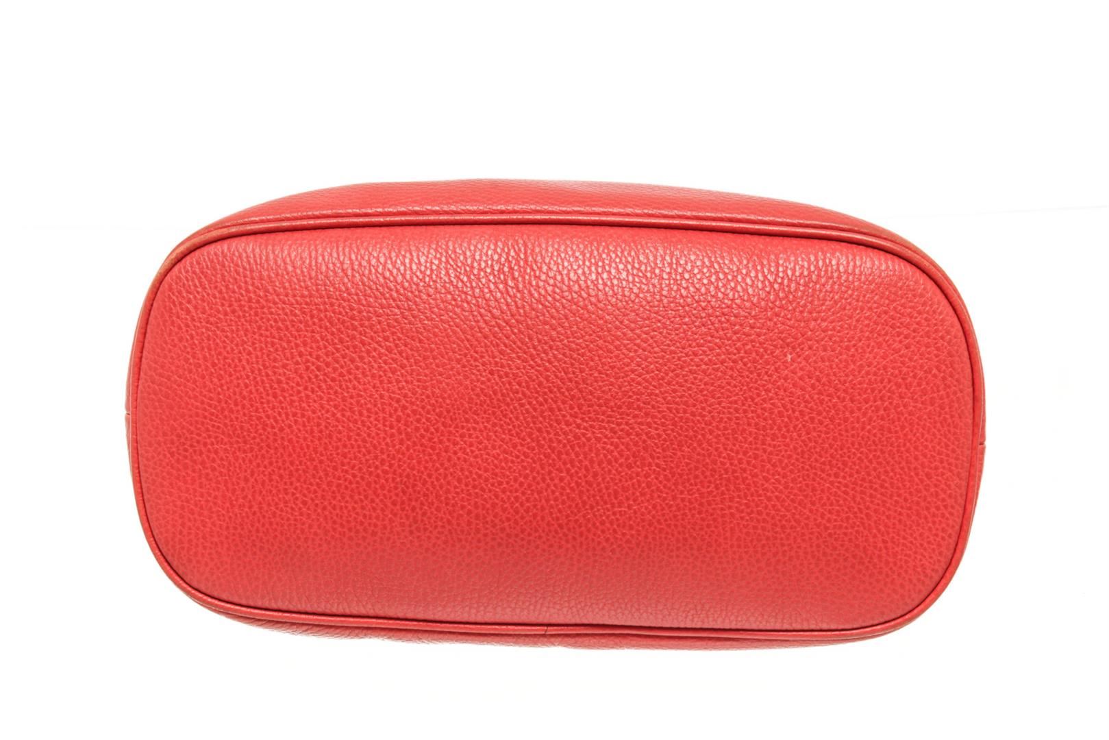 One Gucci Red Calfskin Mini Dome 2 Way Shoulder Bag. Item is sold AS-IS. All available information is listed in the description and shown in the photo. Gucci Red Calfskin Mini Dome 2 Way Shoulder Bag with leather handles, an optional shoulder strap and silver hardware. the zipper opens to a spacious dark brown fabric interior with a patch pocket. Length: 9.25 in, Width: 4.75 in, Height: 7.25 in / 23.49 x 12.06 x 18.41