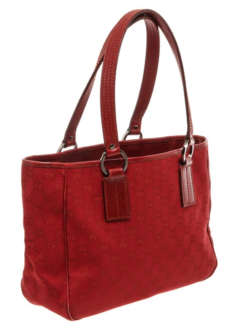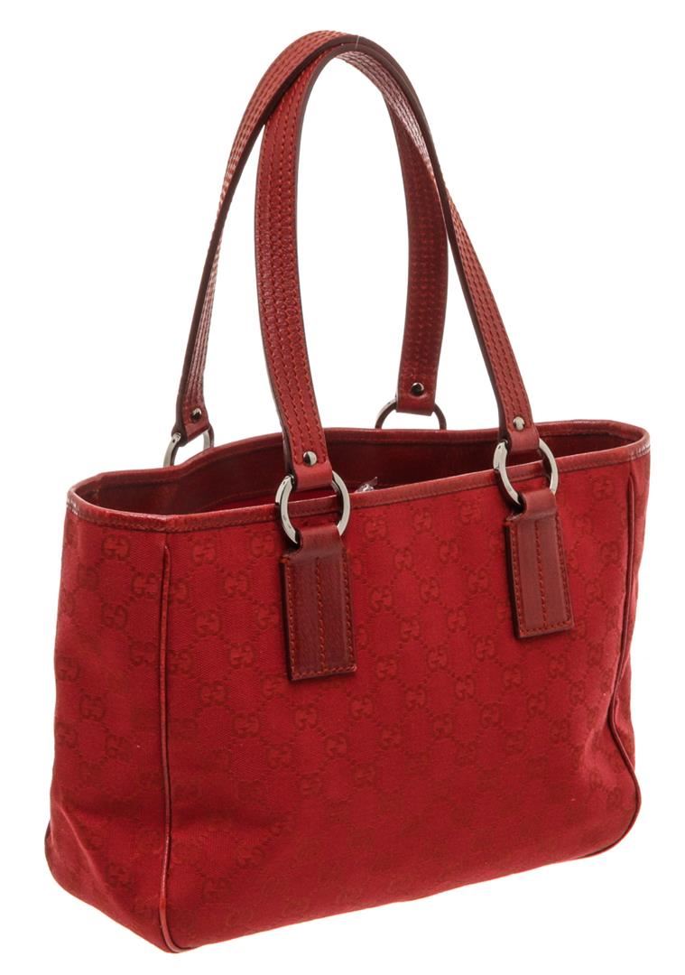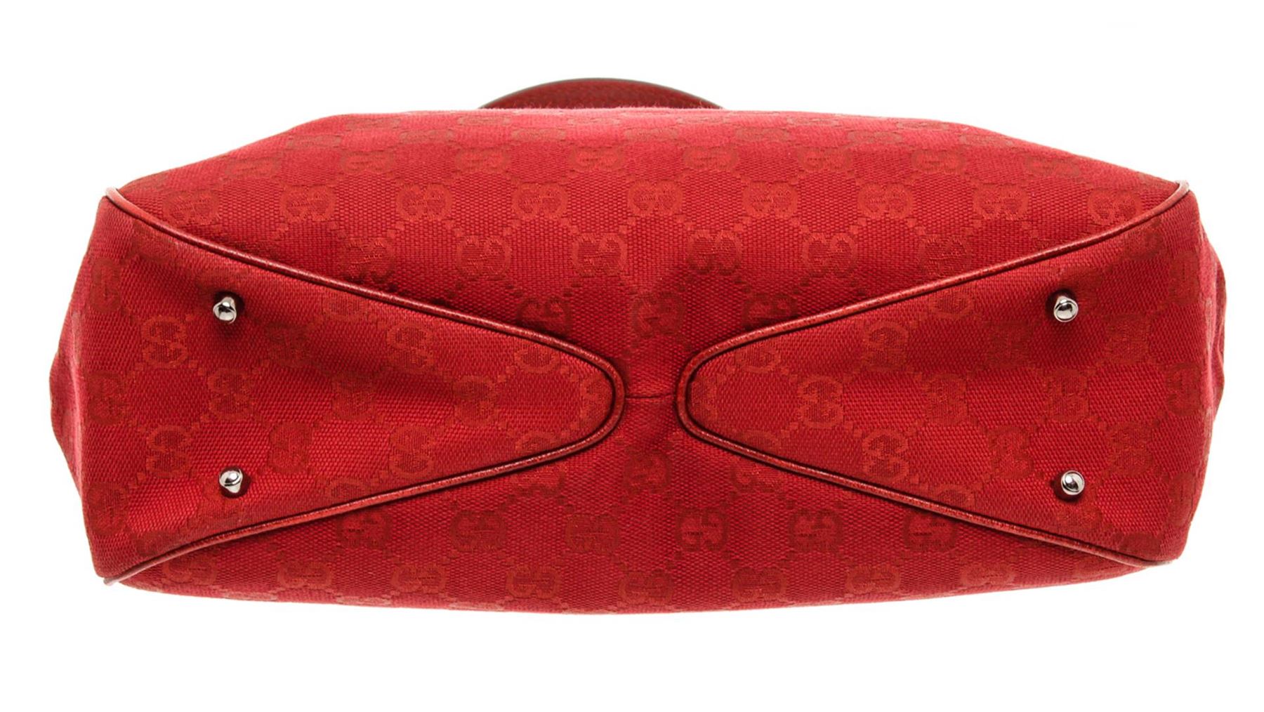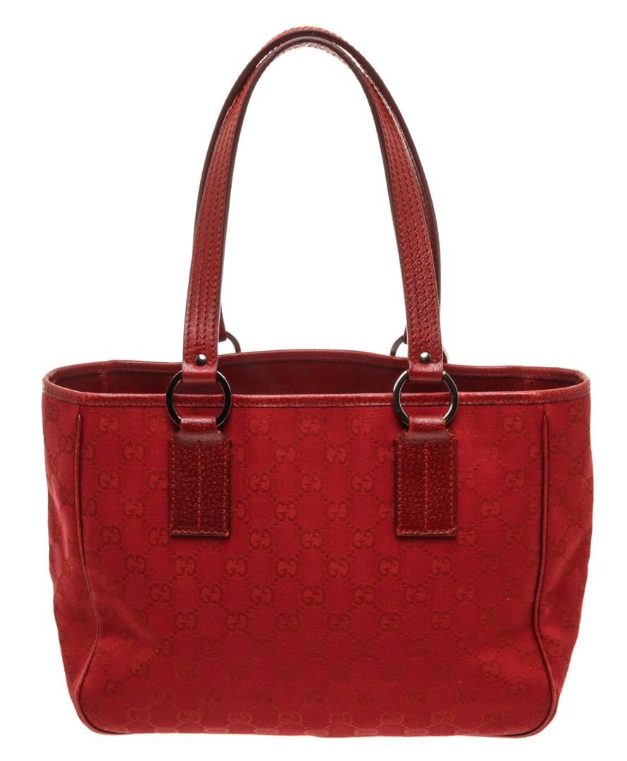 Gucci red GG Canvas small Tote bag with red leather trim, silver-tone hardware, zip pocket at interior wall.