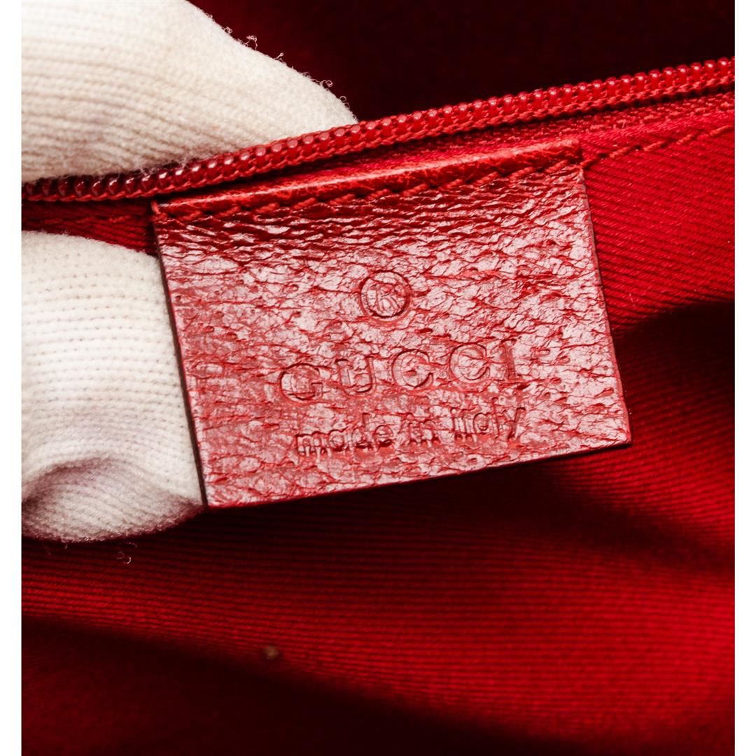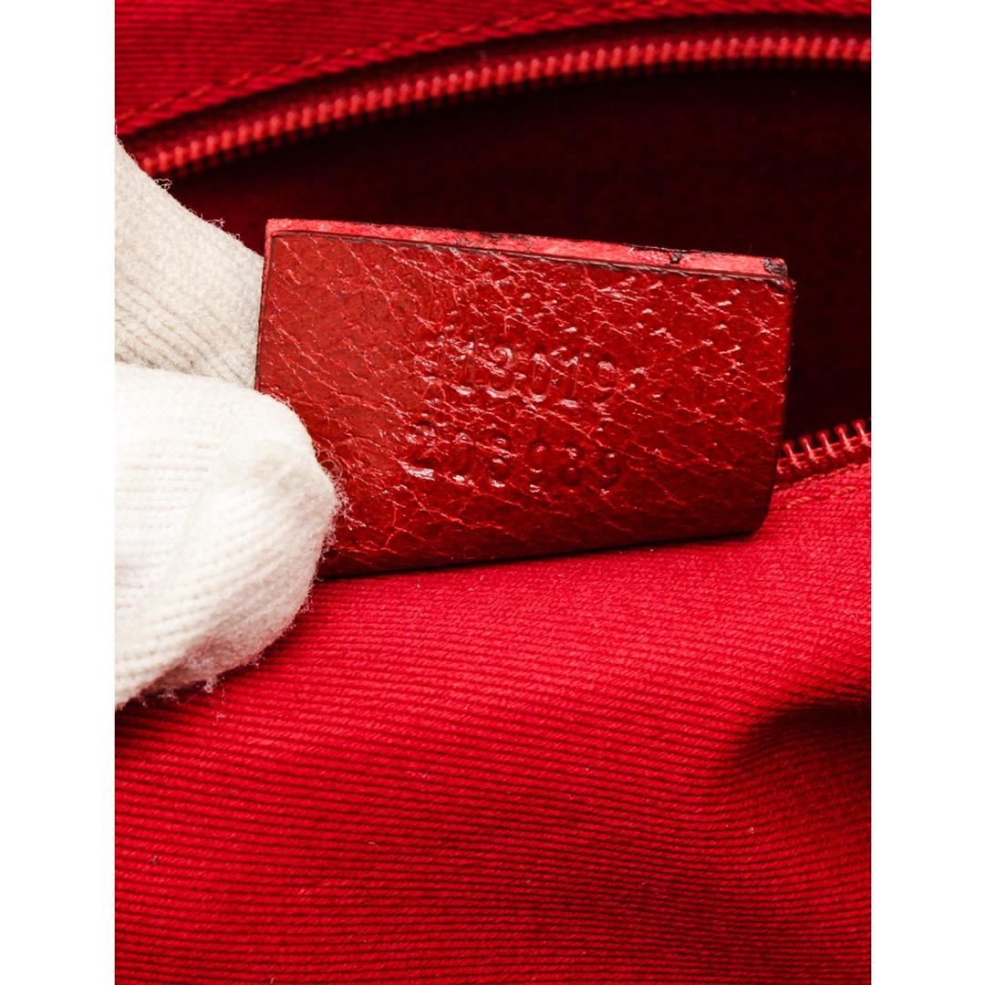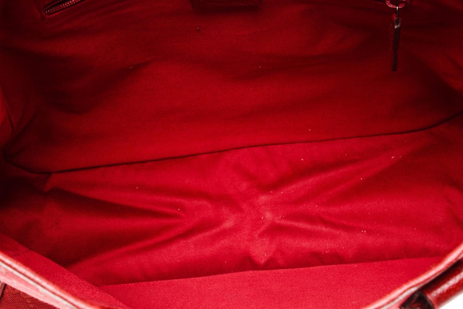 Gucci red GG Canvas small Tote bag with red leather trim, silver-tone hardware, zip pocket at interior wall.