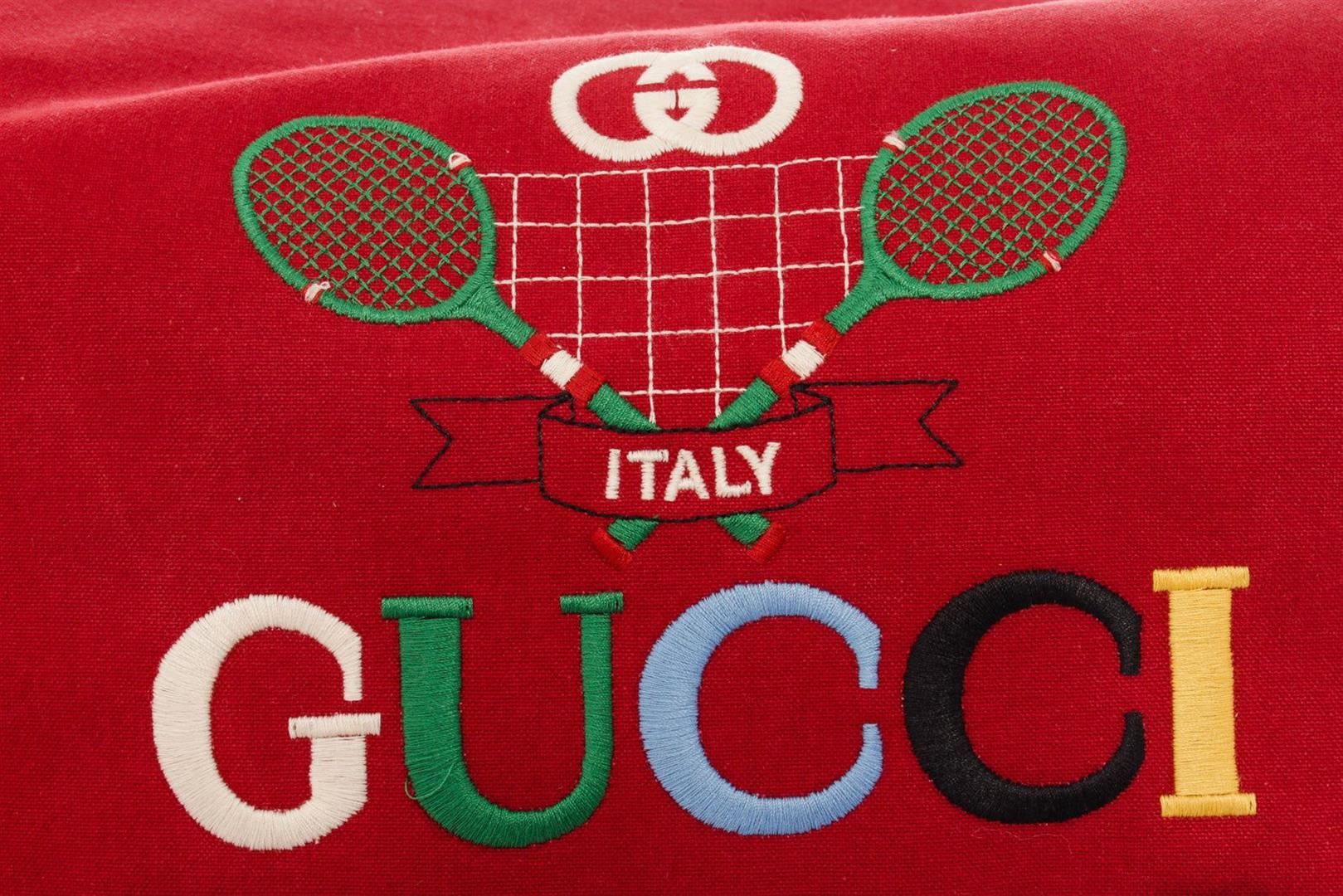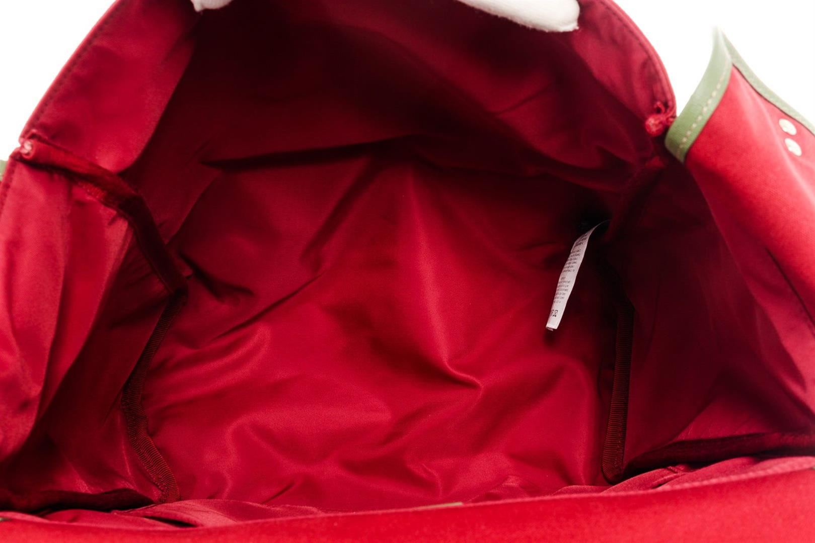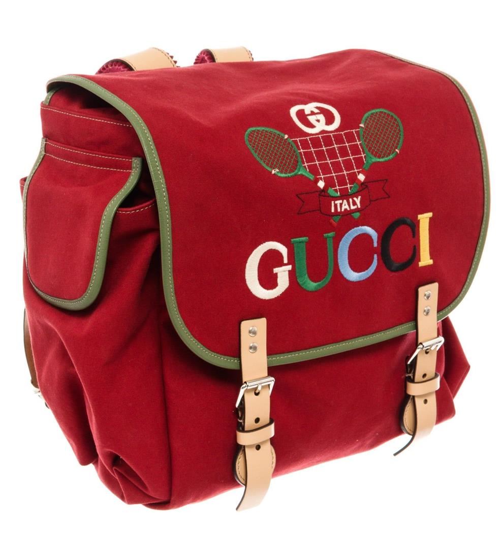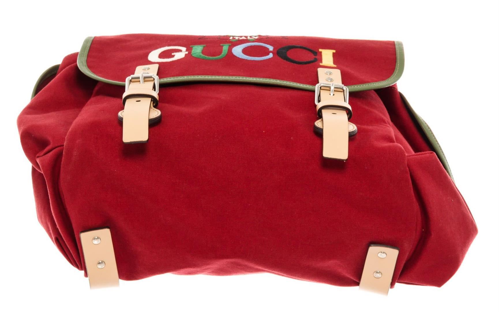 Red GG embroidered canvas Gucci Children's Tennis backpack with silver-tone hardware, tan leather trim, dual adjustable backpack straps, fold over top with magnetic closure, two side pockets and red canvas lining with slip pocket inside.