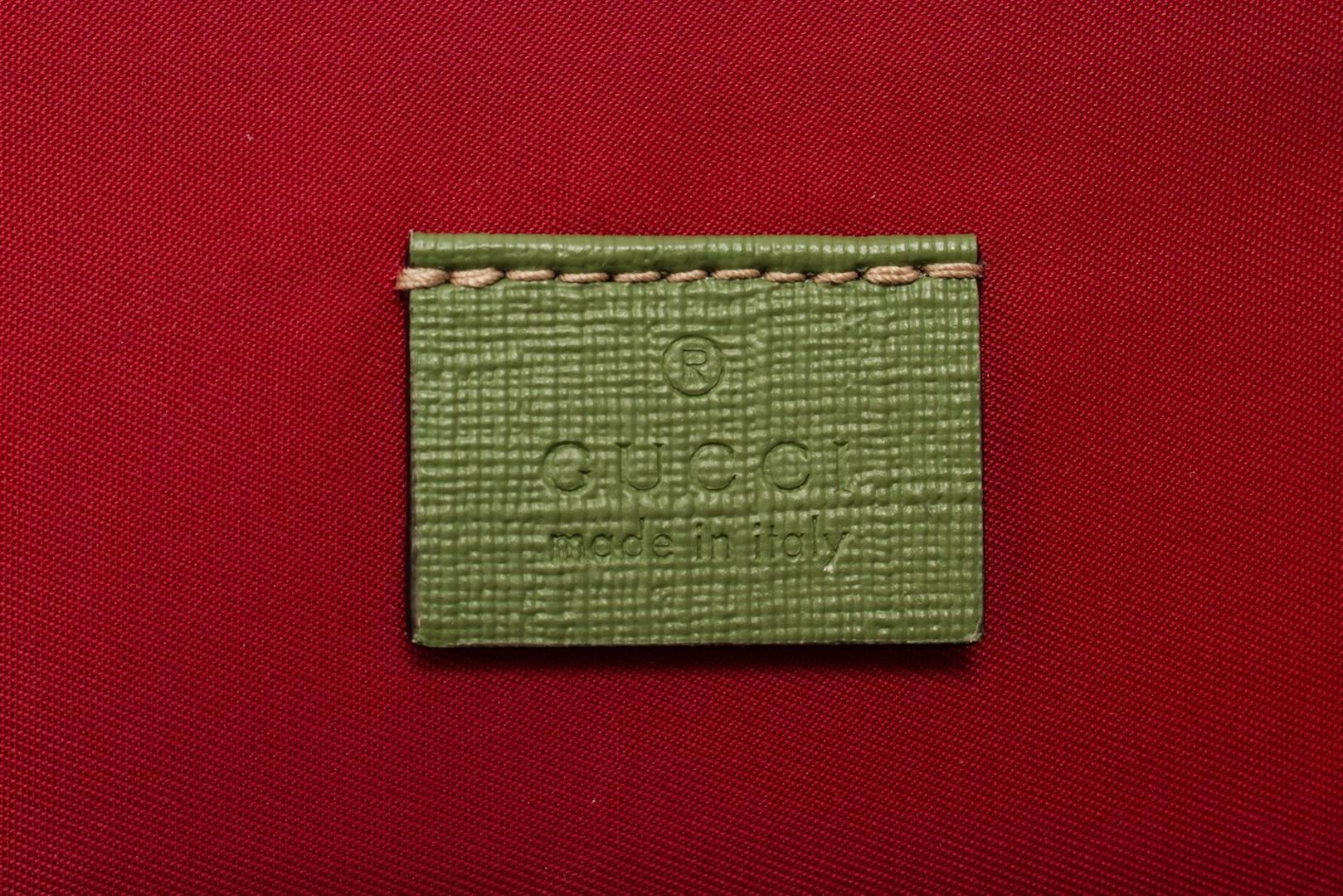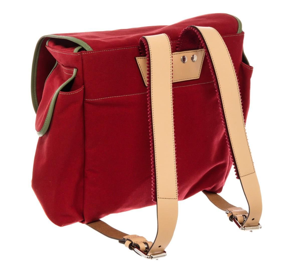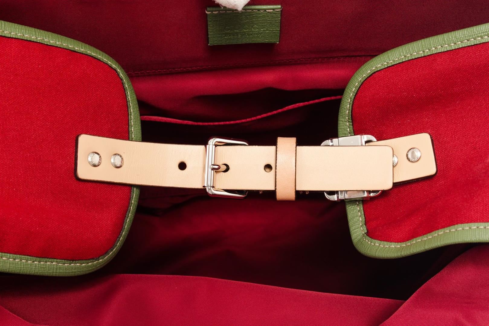 Red GG embroidered canvas Gucci Children's Tennis backpack with silver-tone hardware, tan leather trim, dual adjustable backpack straps, fold over top with magnetic closure, two side pockets and red canvas lining with slip pocket inside.