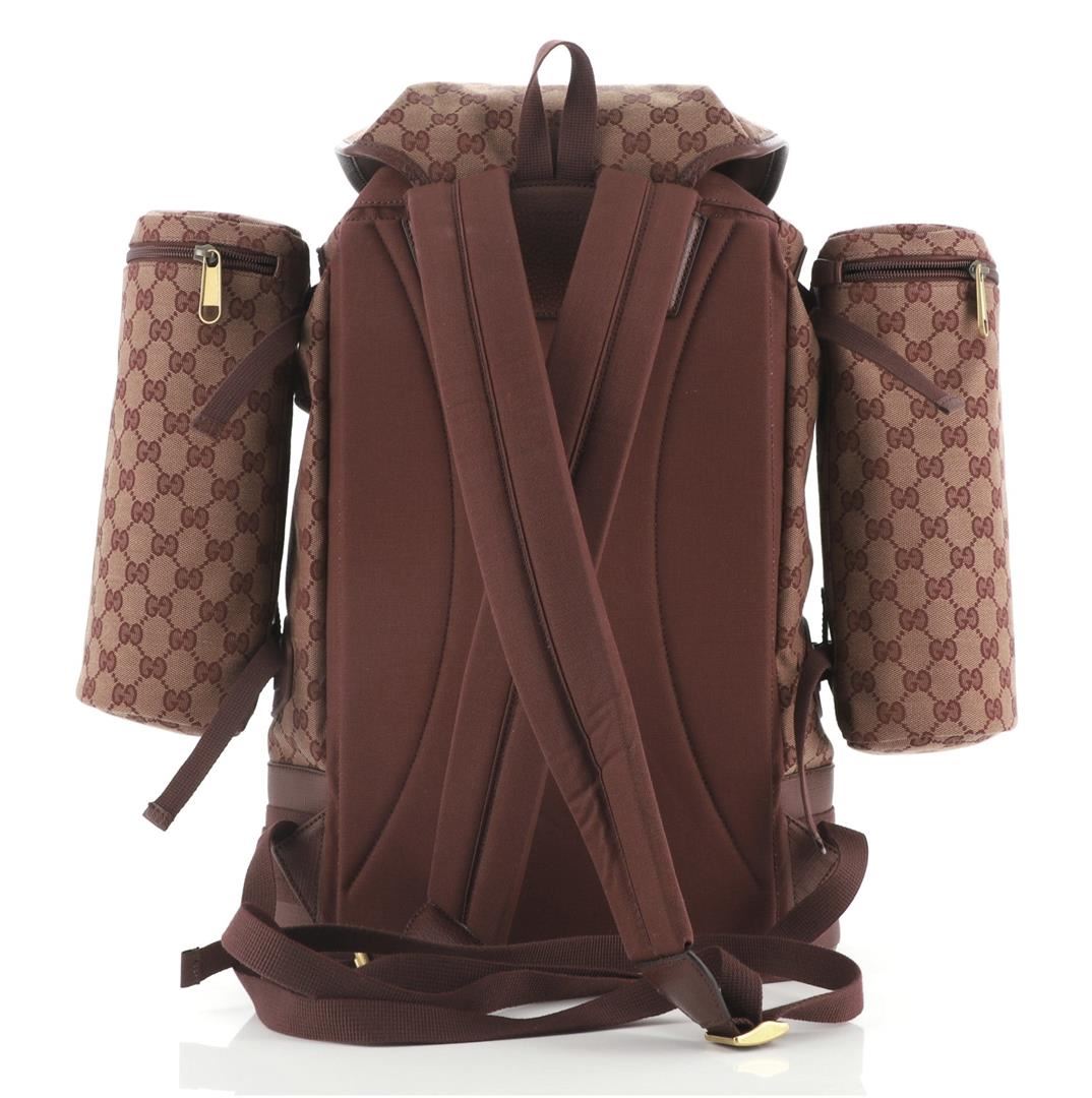 Gucci Multiple Pocket Large Backpack features red GG Supreme Monogram coated canvas, one front pocket with zipper, two side pockets with zippers and black buckles, red canvas top handle, two padded canvas shoulder straps that can be adjusted, flat top clo