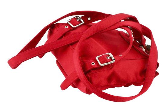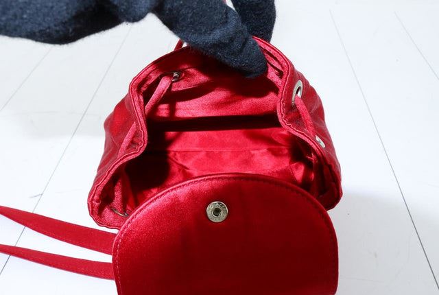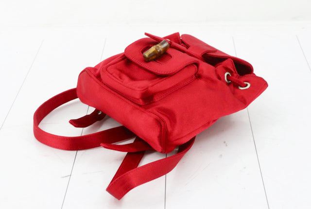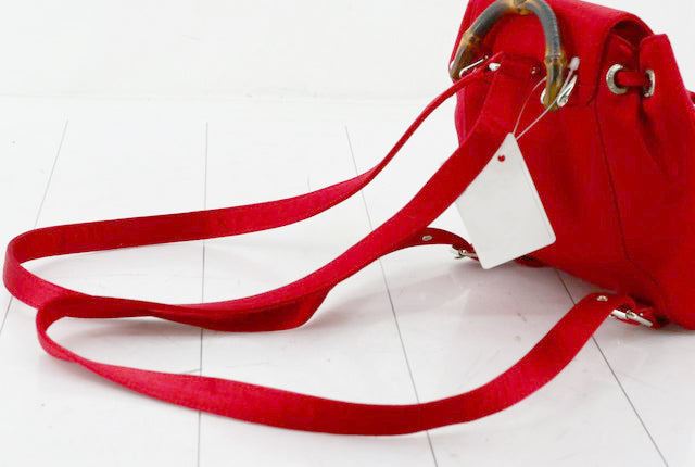 This backpack features red leather trim, an exterior front flap pocket with bamboo twist lock closure, flat leather back straps, a bamboo top handle, top flap with buckle closure, drawstring closure, and an interior zip pocket. 9.8" x 2.8" x 8.7"