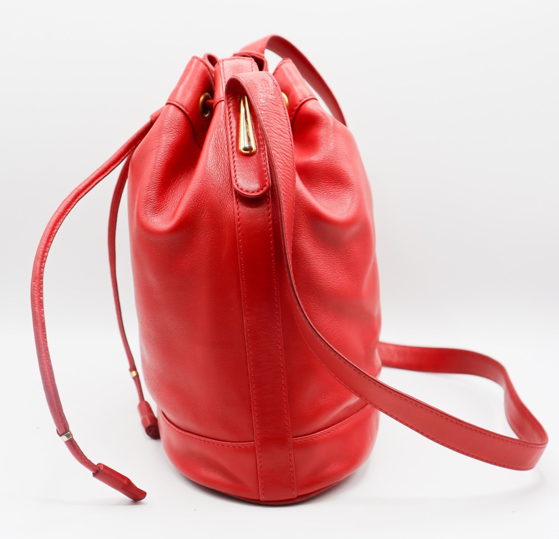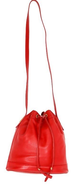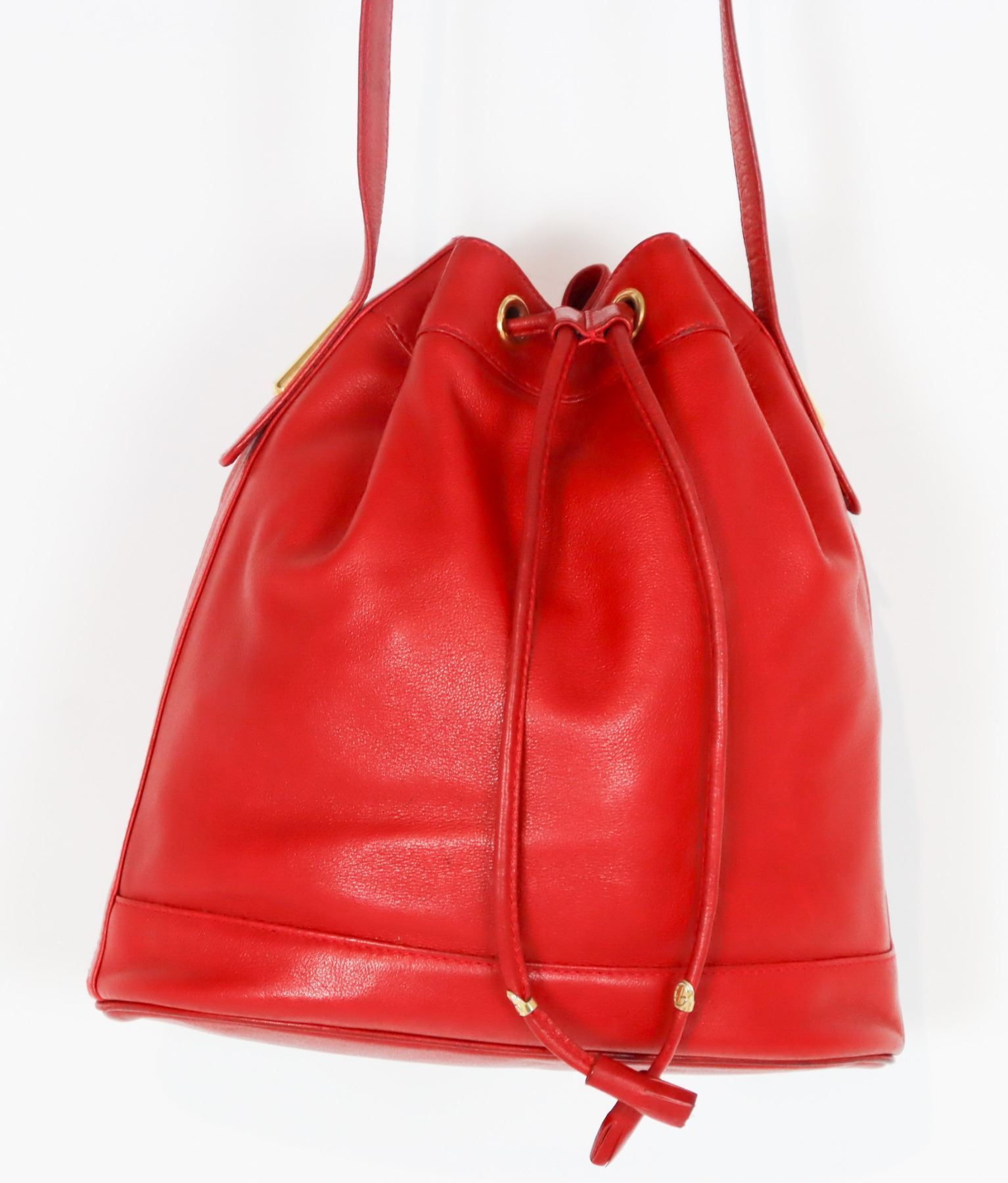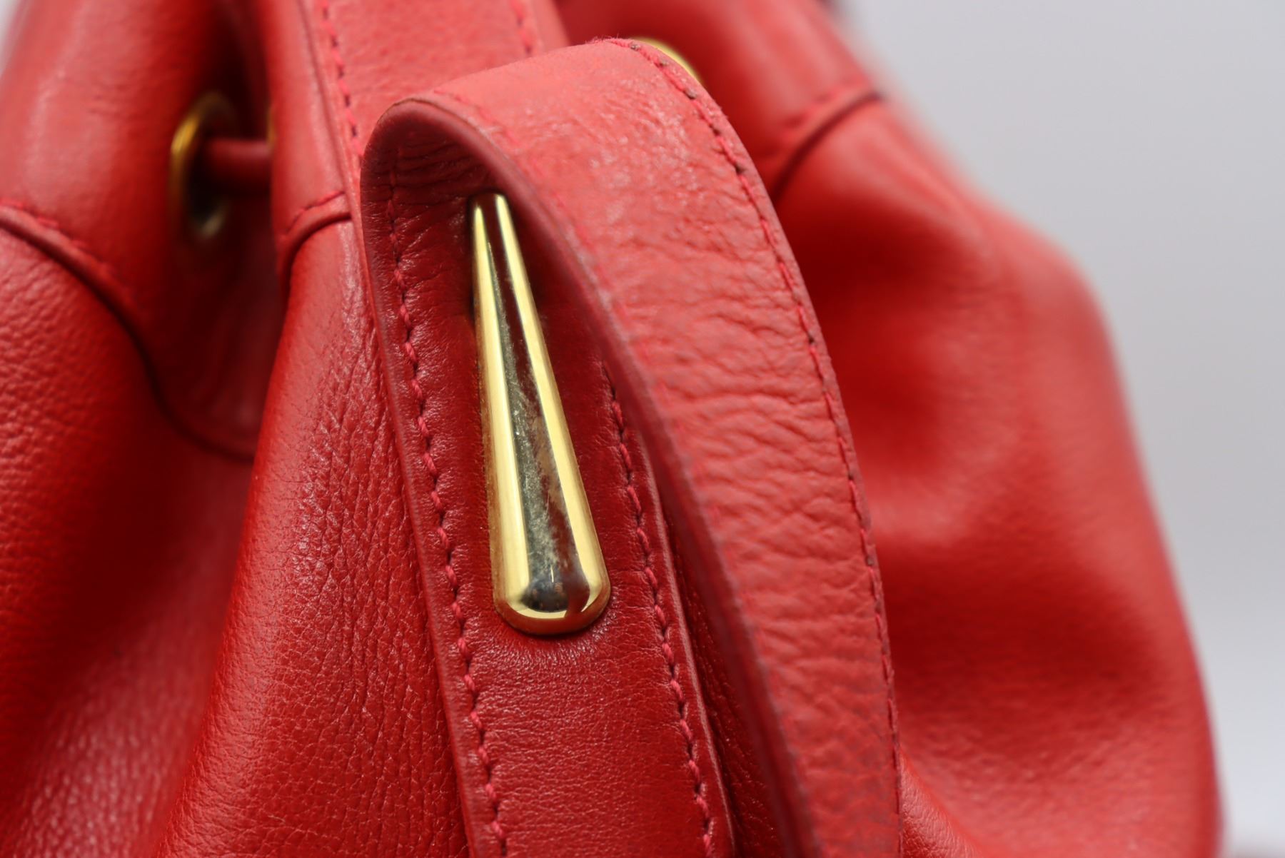 Lovely red leather handbag with metallic finishing and nameplate on interior.
