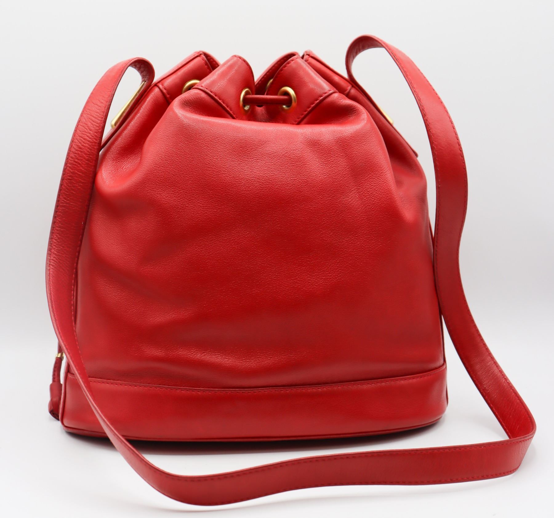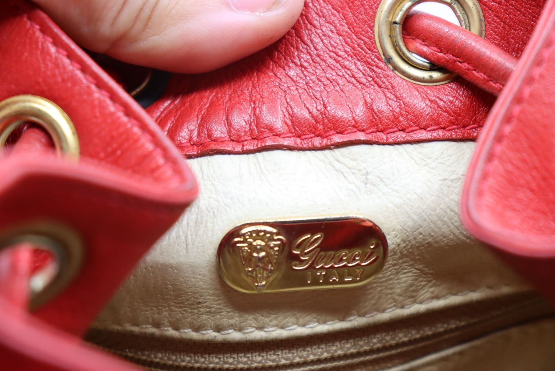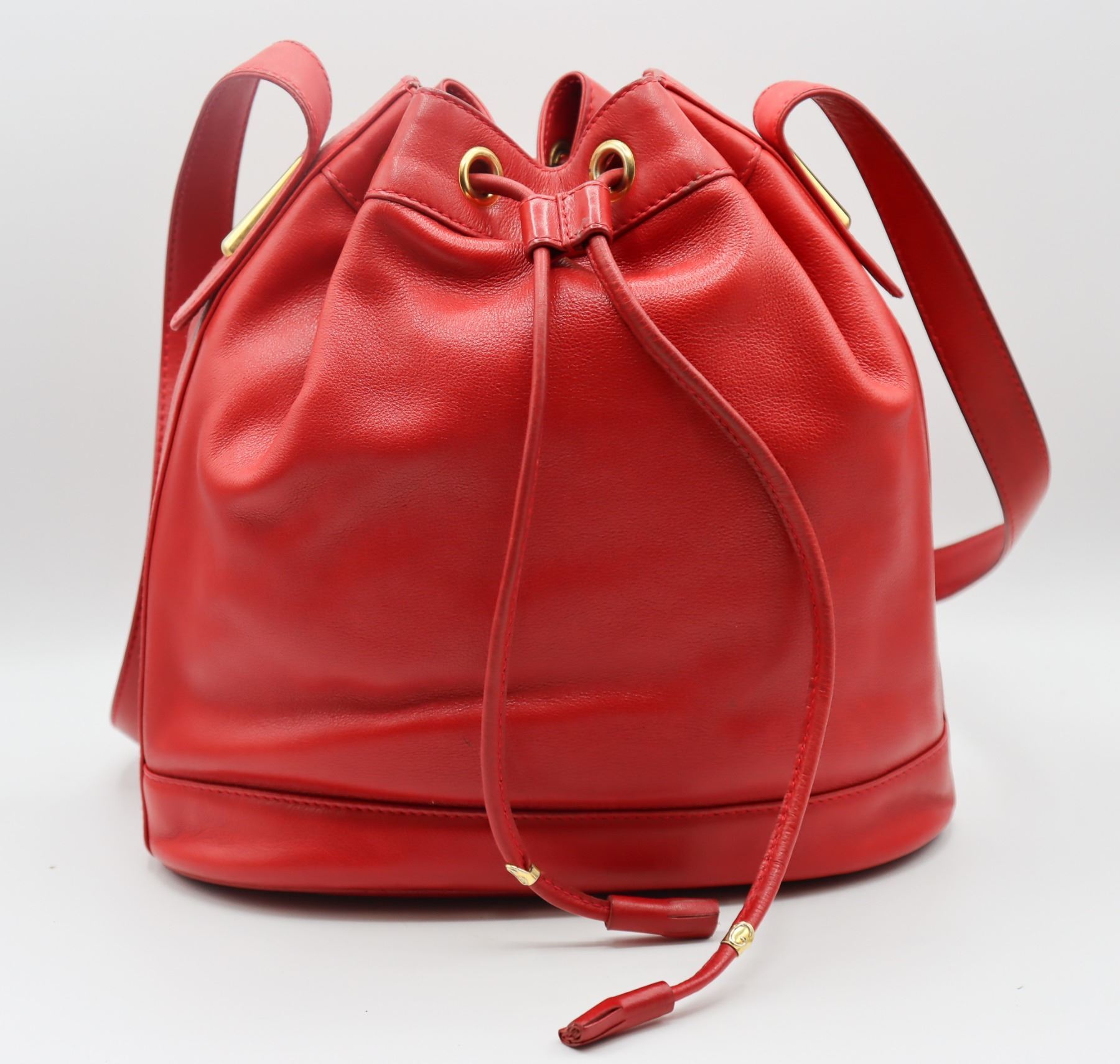 Lovely red leather handbag with metallic finishing and nameplate on interior.
