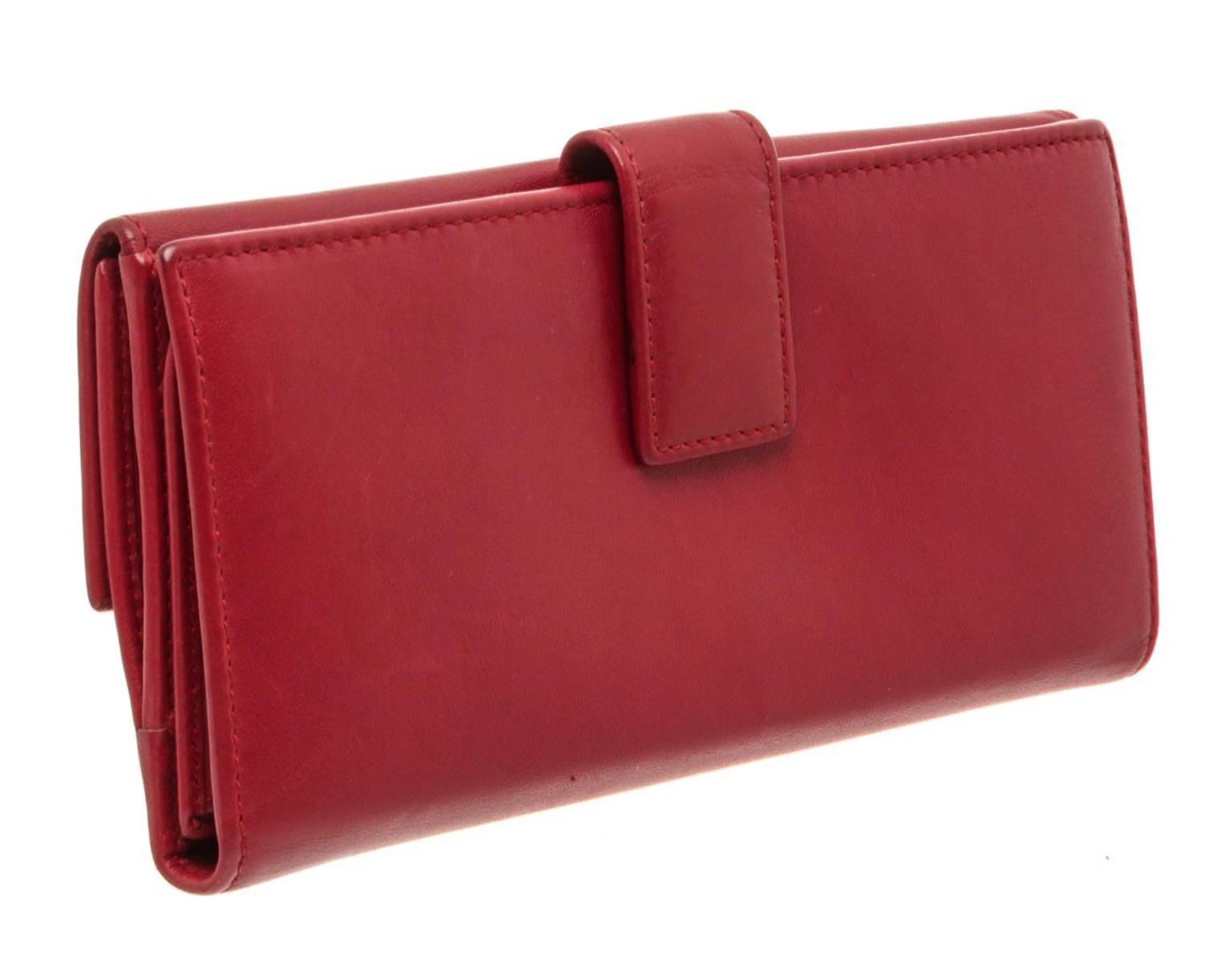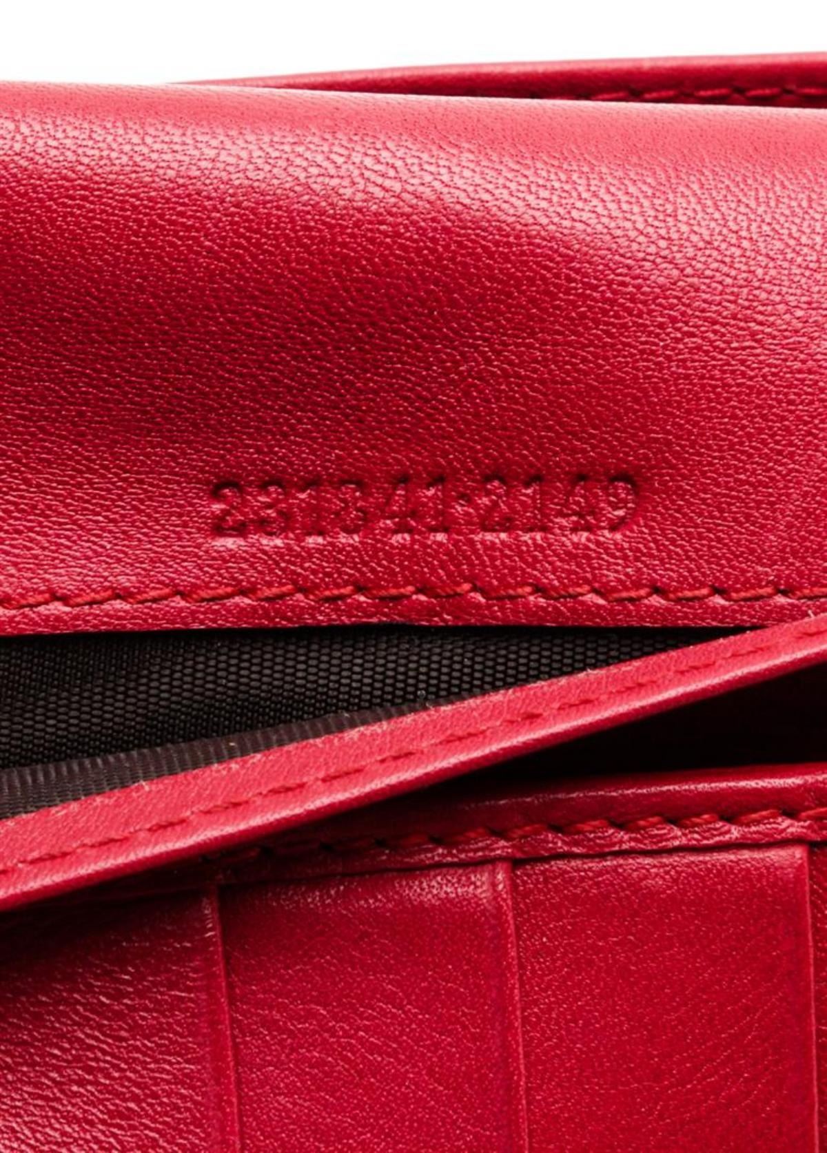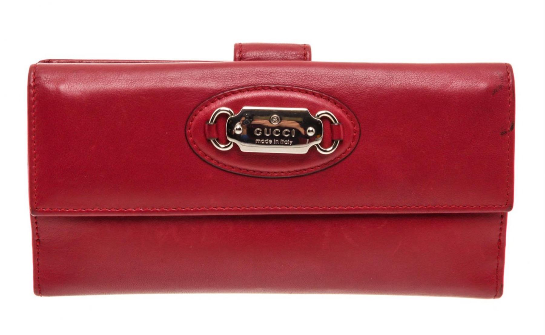One Gucci Red Leather Continental Wallet. Gucci red leather continental wallet with silver-tone hardware, four bill pockets, seven card holders, large change pocket, snap closure.