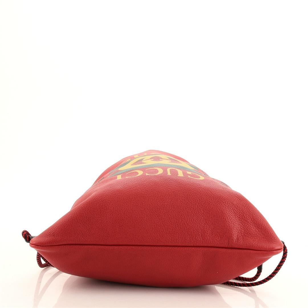 Gucci Drawstring Large Backpack is crafted from red leather with retro Gucci logo, two leather top handles, two adjustable shoulder straps, brown leather trim and a drawstring closure on top.