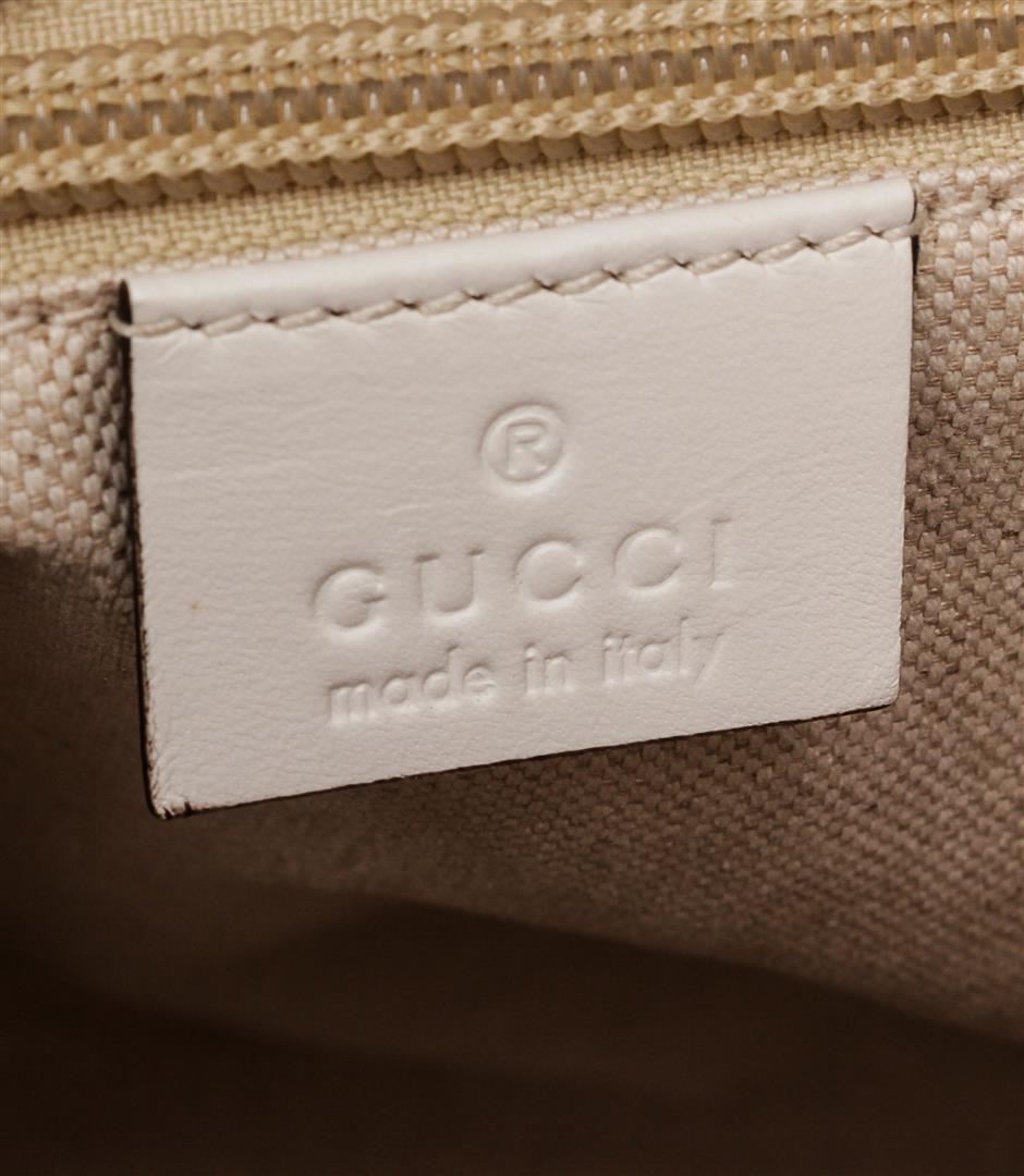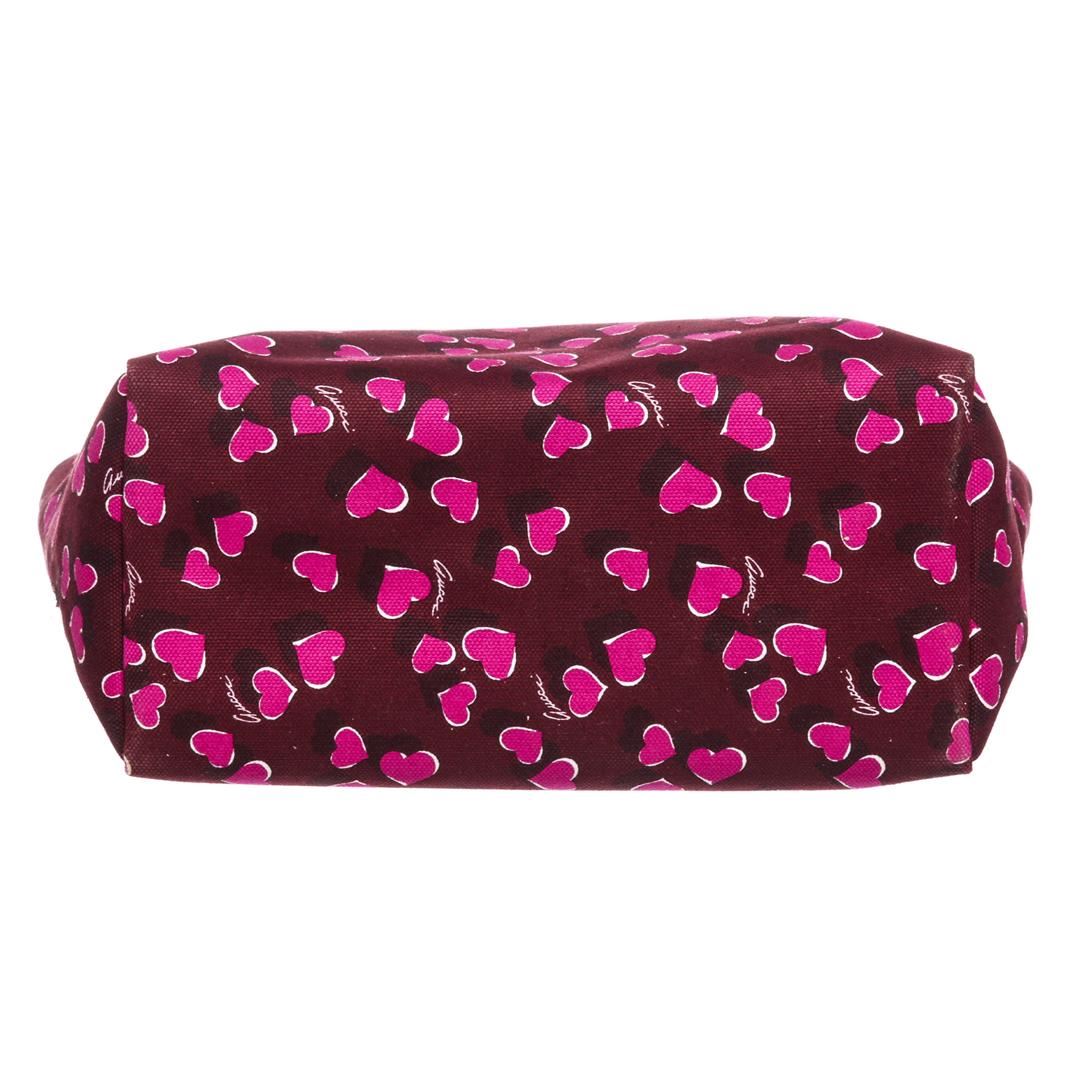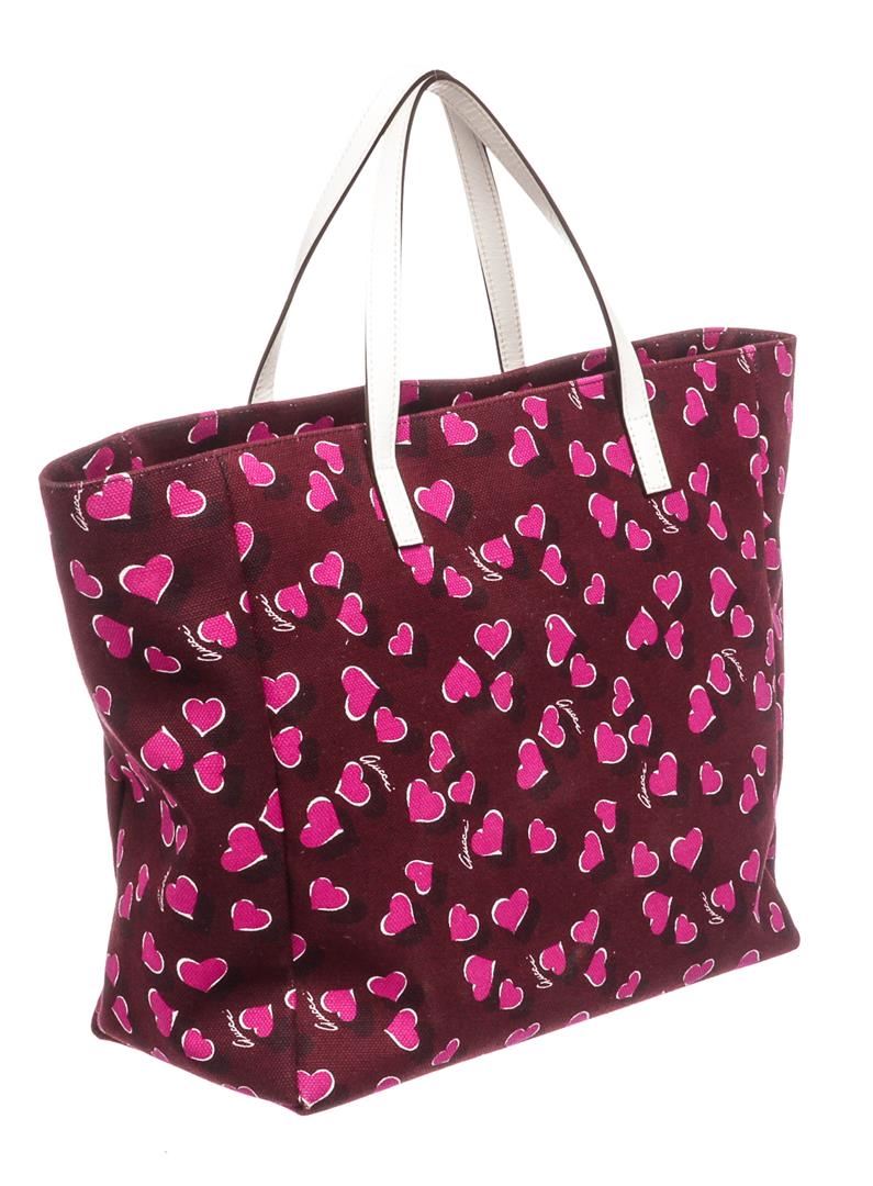 Red pink and white canvas leather Gucci heart print tote with silver-tone hardware, white leather trim, dual flat top handles, natural canvas lining, three pockets at interior walls; one with zip closure and open at top.
