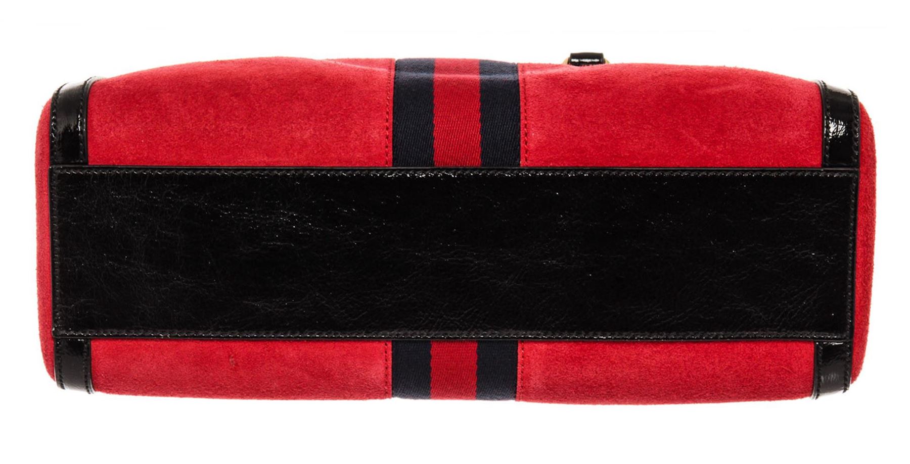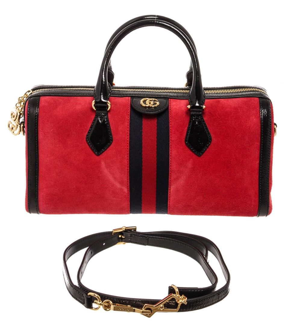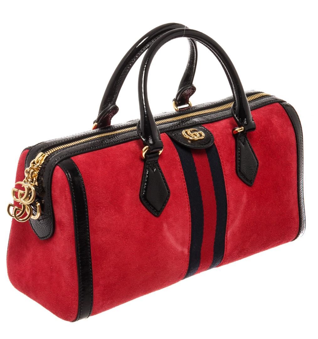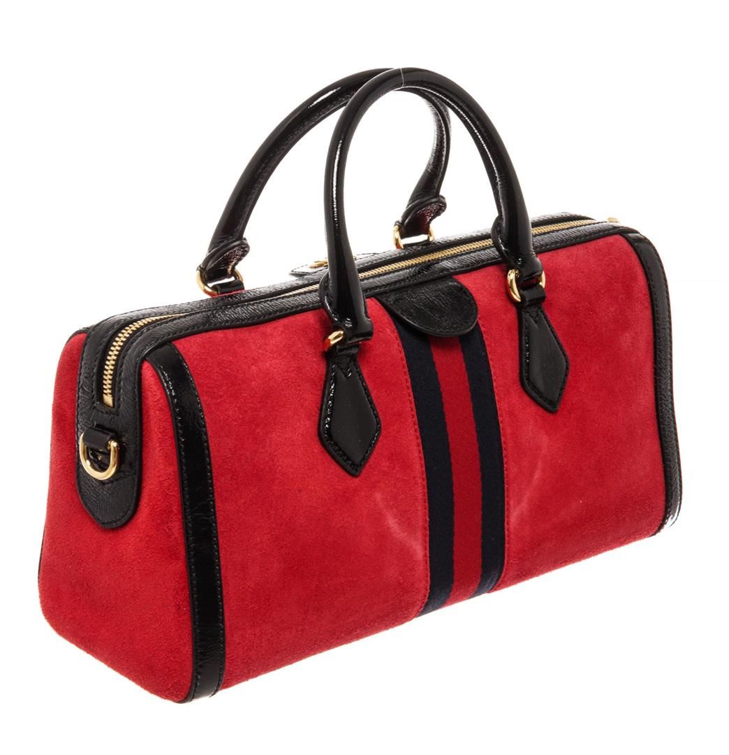 Gucci Ophidia Medium Boston bag with red suede leather and black patent leather trim, dual rolled top handles and detachable shoulder strap, gold-tone hardware, blue and red Web signature stripes around the bag, GG detailing on the front, upper zipper clo