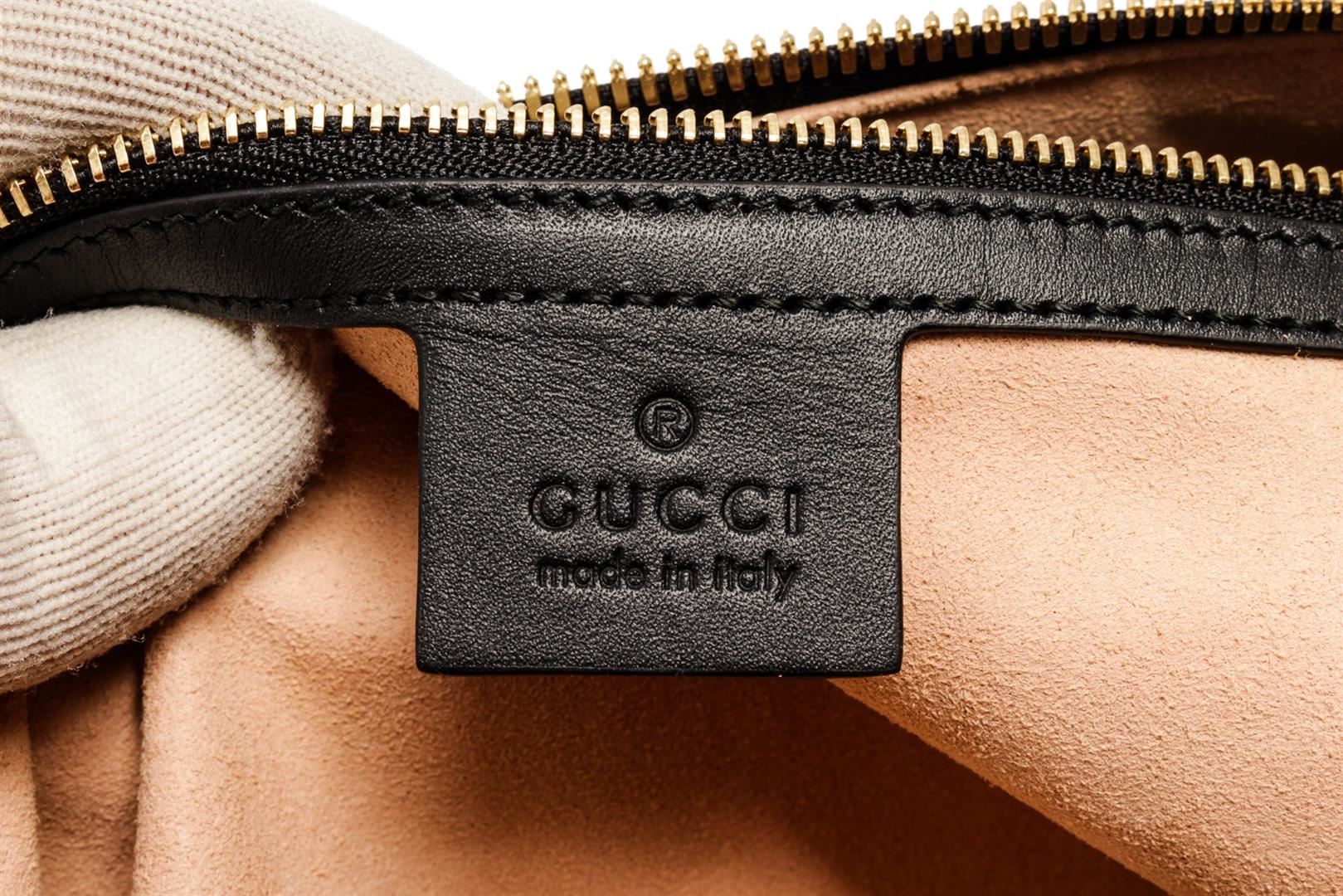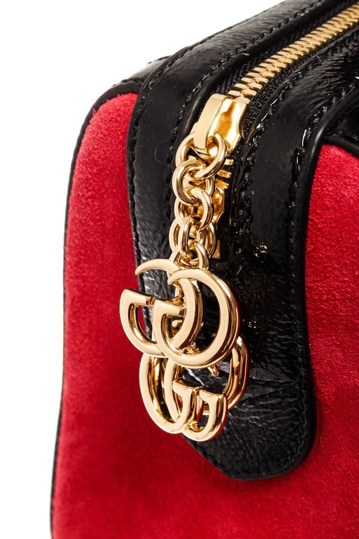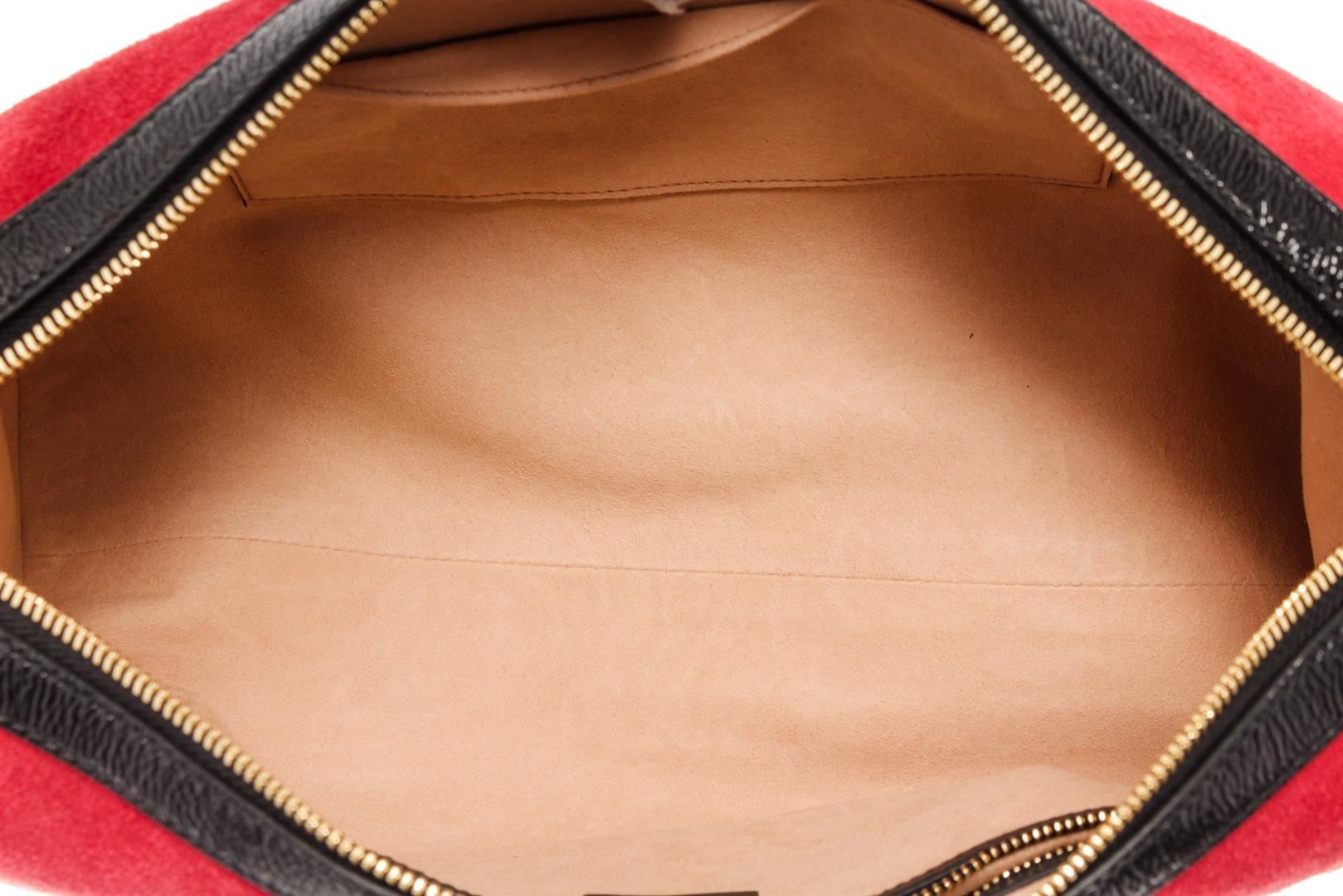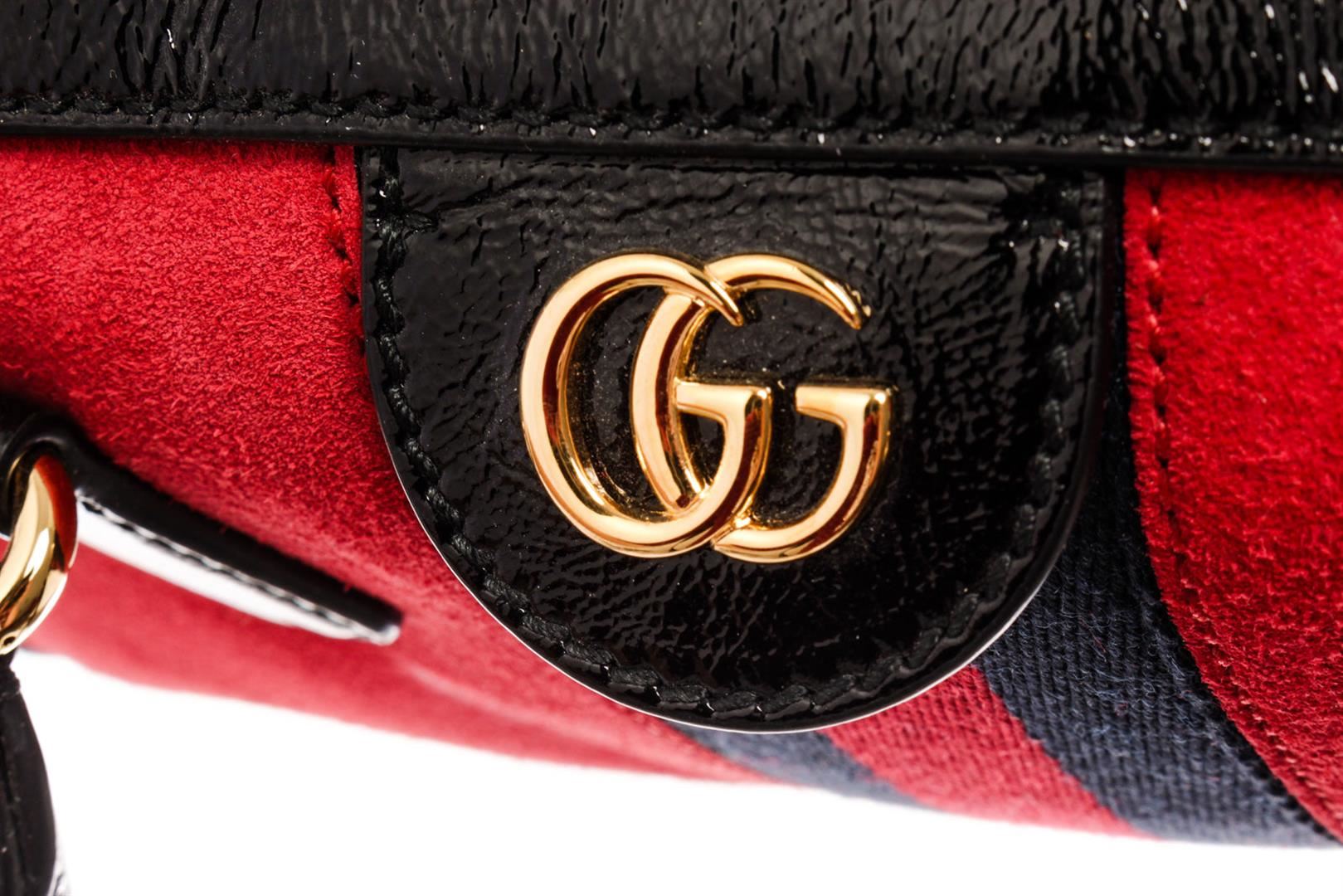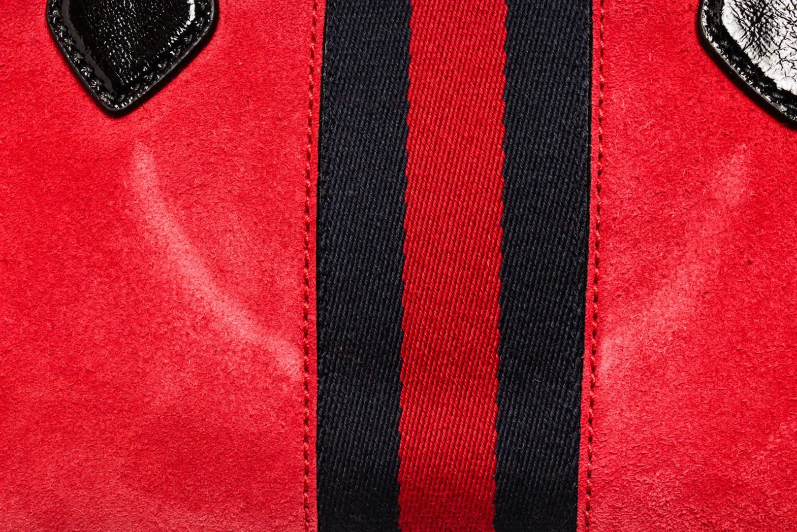 Gucci Ophidia Medium Boston bag with red suede leather and black patent leather trim, dual rolled top handles and detachable shoulder strap, gold-tone hardware, blue and red Web signature stripes around the bag, GG detailing on the front, upper zipper clo