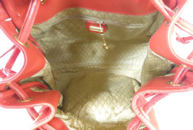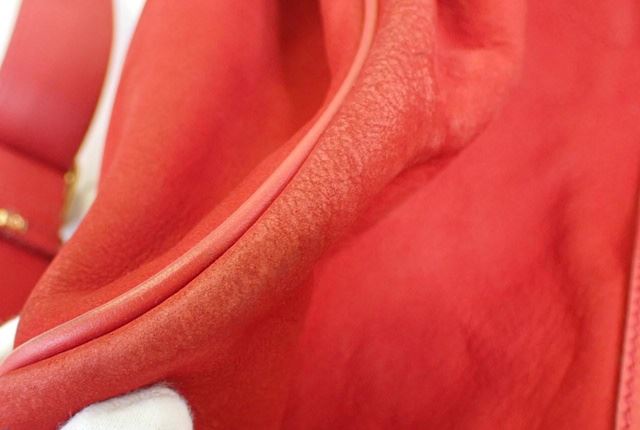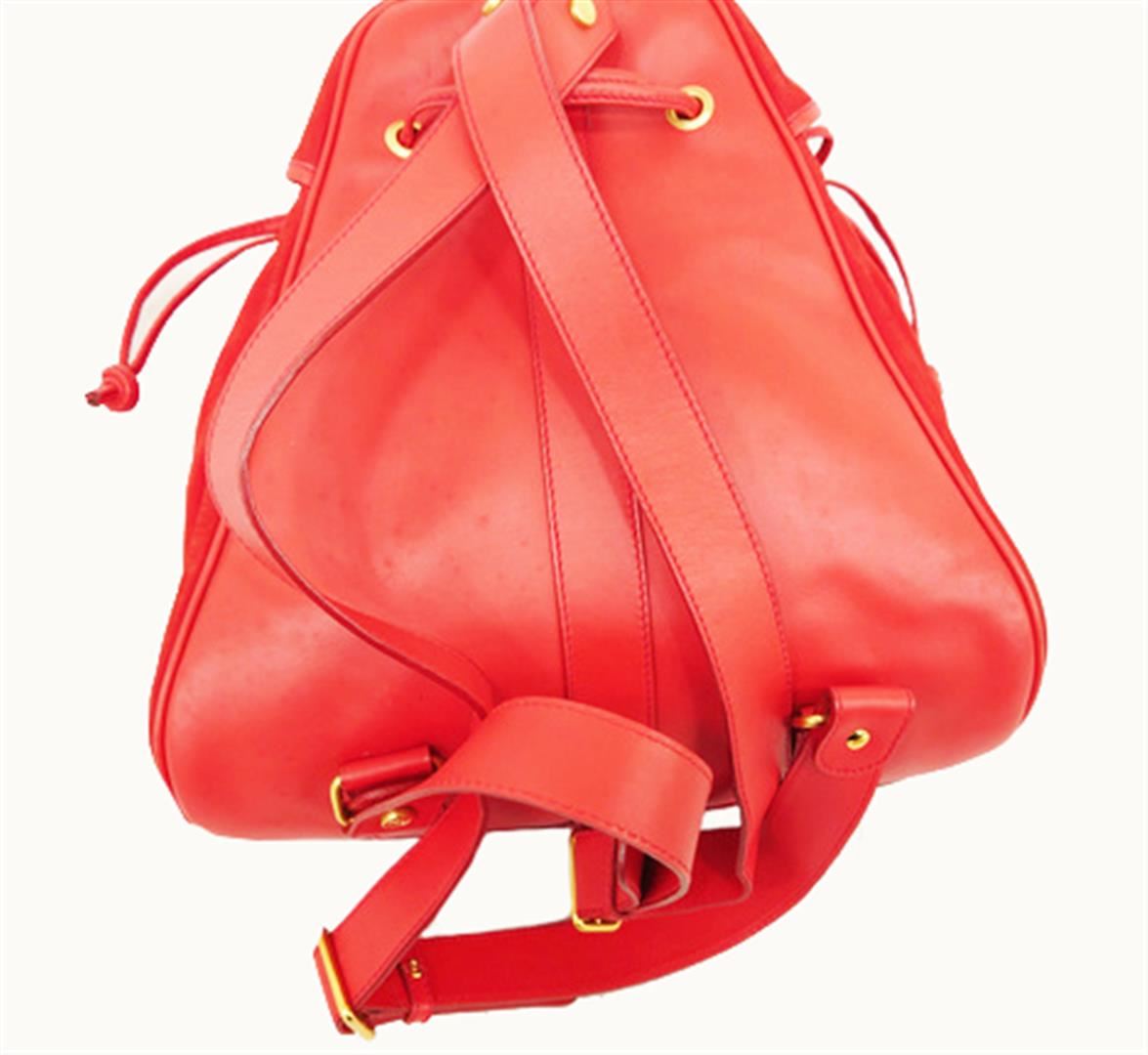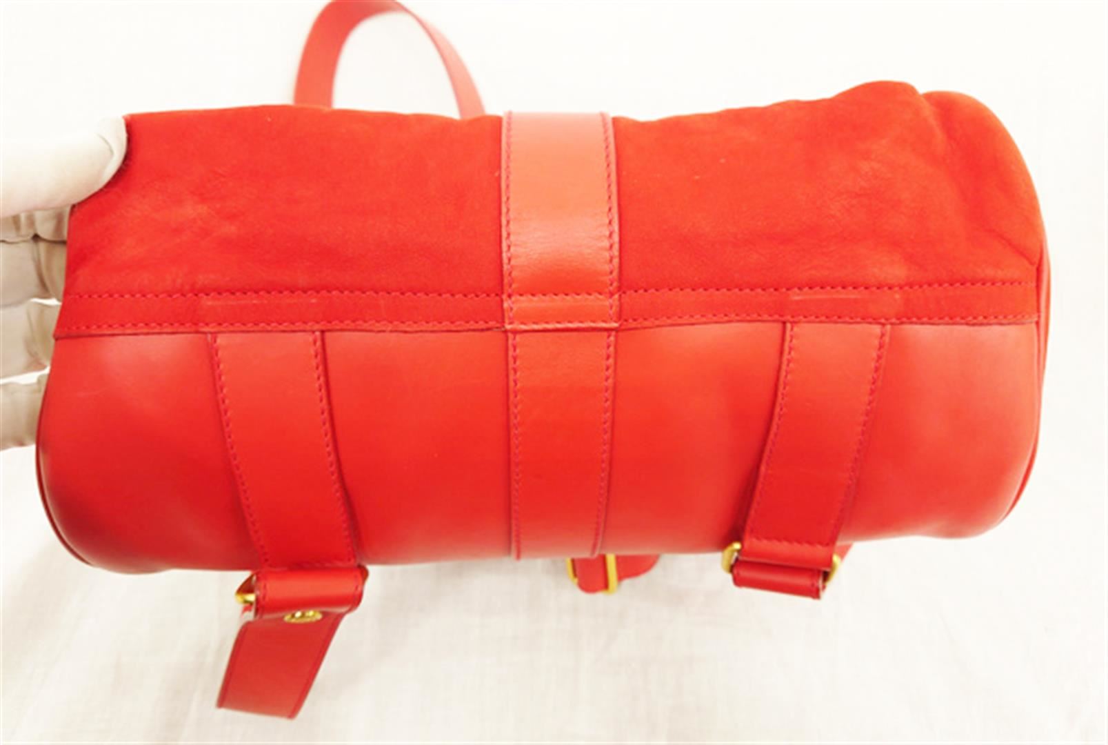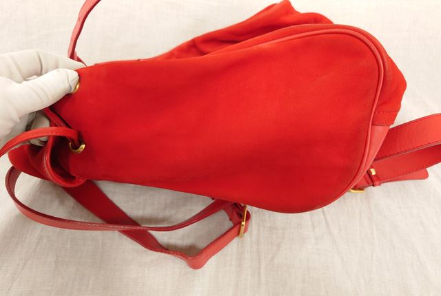 This Gucci backpack features a red suede body, gold-tone hardware, dual flat leather shoulder straps, beige canvas lining, one zip pocket inside, drawstring closure at top with flap and buckle closure above. Length: 13.4", Width: 14.2", Depth: 6.3", Sh
