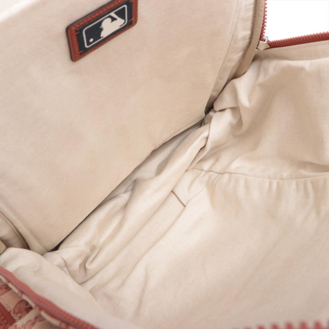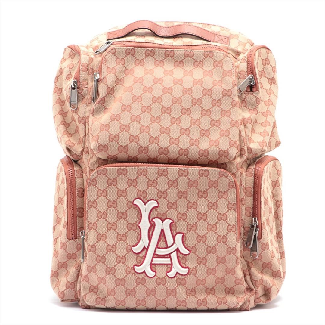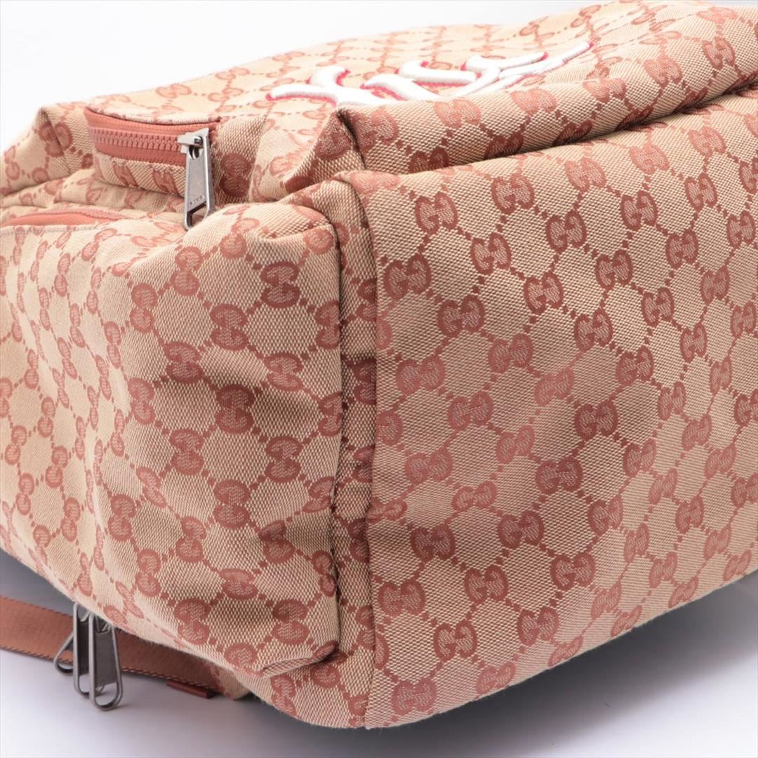 Gucci rust brown GG canvas LA Angles backpack with silver-tone hardware, rust red leather trim, embellished MLB LA Angles applique on front pocket, four exterior zipper pockets, padded back, beige canvas lining, interior padded large slip pocket, dual adj