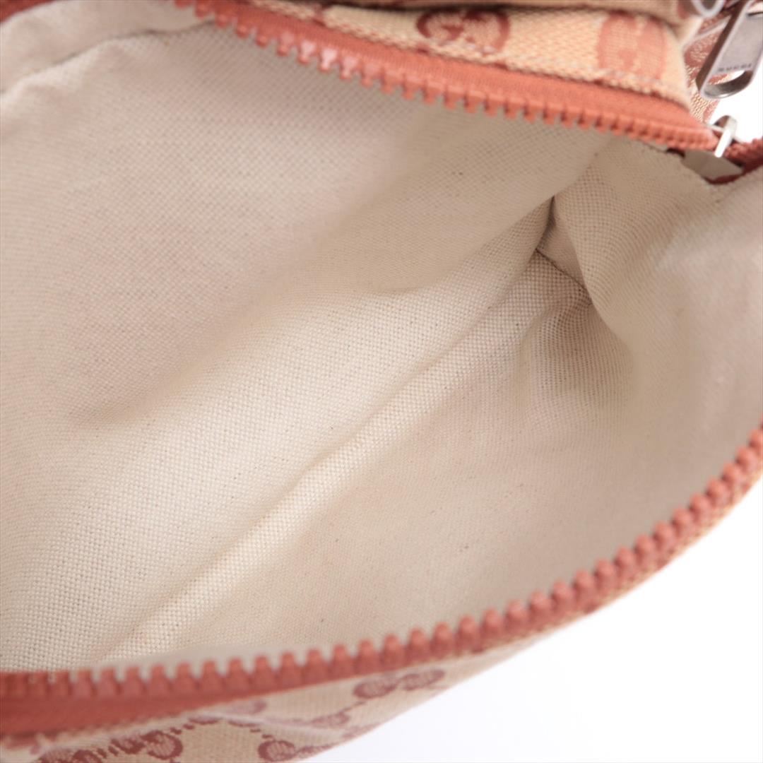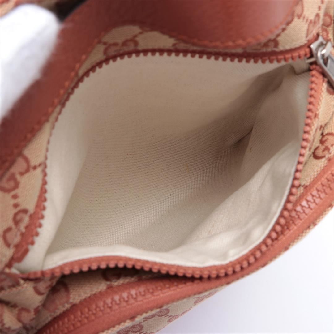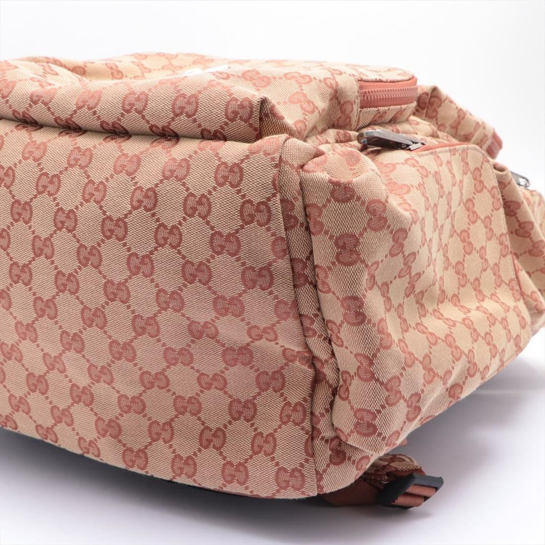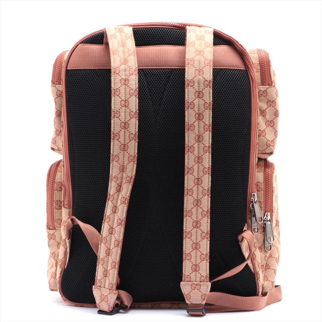 Gucci rust brown GG canvas LA Angles backpack with silver-tone hardware, rust red leather trim, embellished MLB LA Angles applique on front pocket, four exterior zipper pockets, padded back, beige canvas lining, interior padded large slip pocket, dual adj