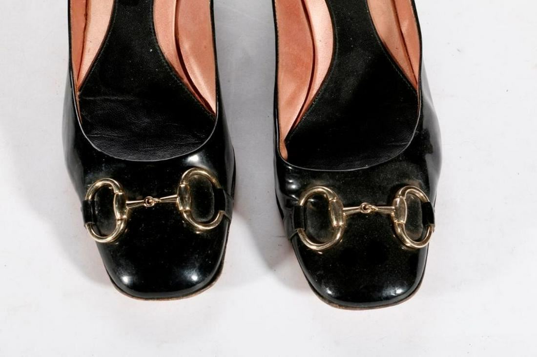 Two pairs of Gucci patent leather shoes; one with signature Gucci cloth, and bamboo gold buckle (both US size 10.5 B). Please note wear to soles in photos. Items are sold as is. Please inquire about condition if not otherwise stated.