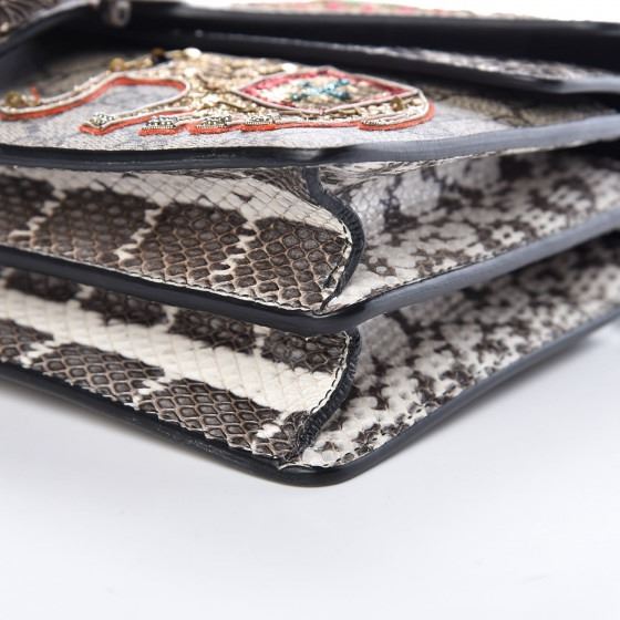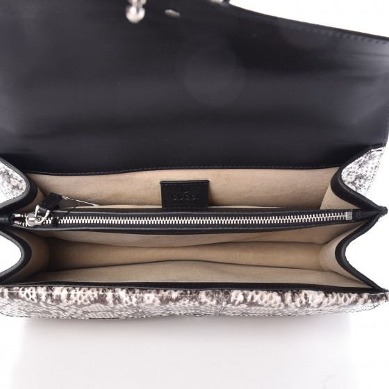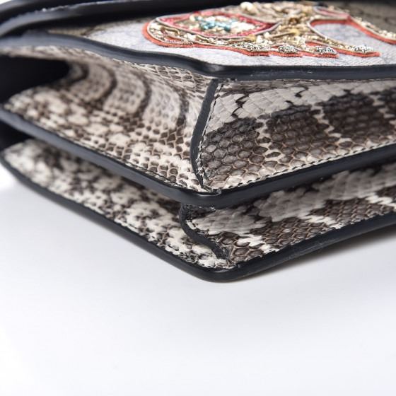 Crafted of Gucci GG supreme monogram canvas and black and white elaphe with multicolored embroidered detailing. This bag features an aged silver chain looping shoulder strap complemented with a tiger head horseshoe closure. This shoulder bag opens to a rich beige suede interior with a front patch pocket.