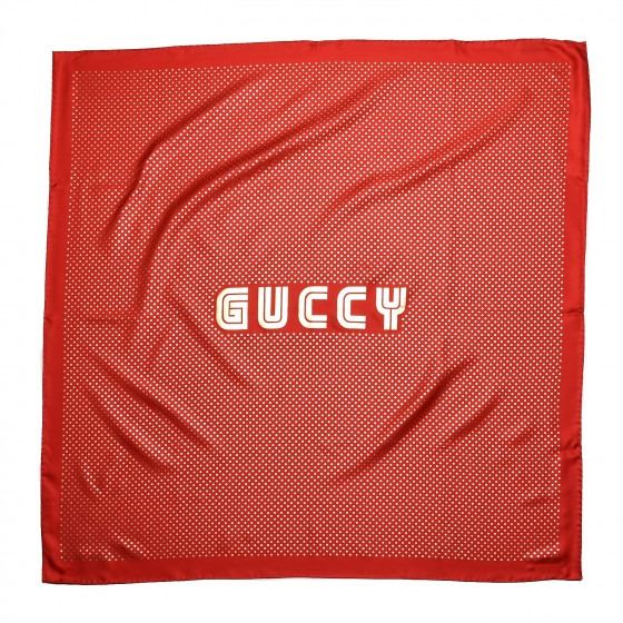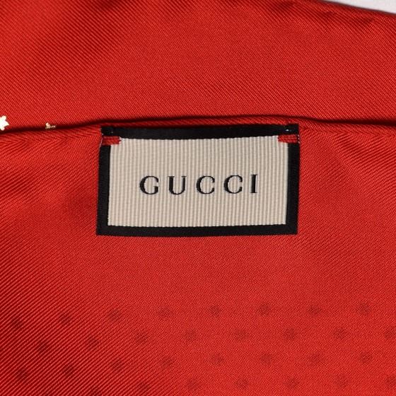 This scarf is crafted of 100% silk in red. It features gold stars and a gold Guccy logo centered in the middle.