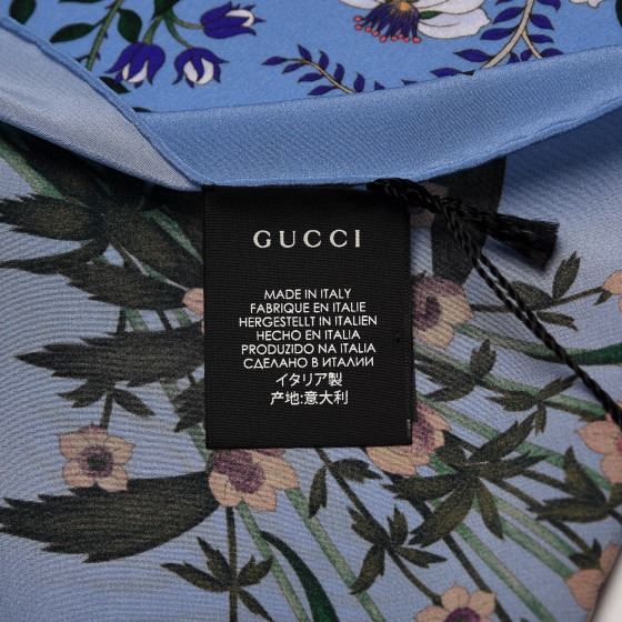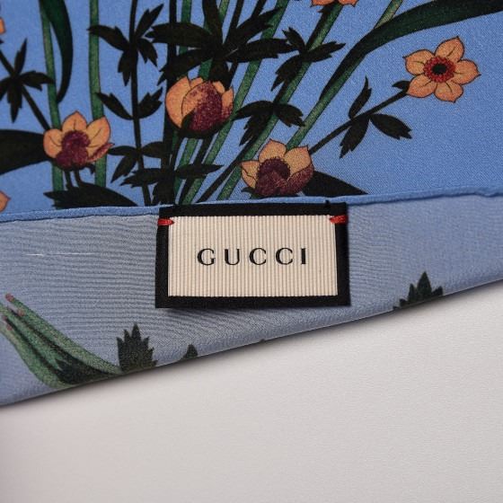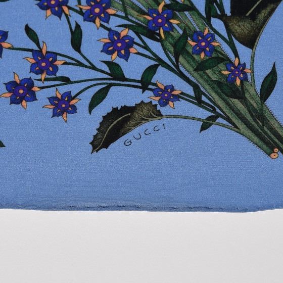 Bluette scarf is crafted of 100% silk, and features a beautiful array of bright colorful flowers on a blue background.