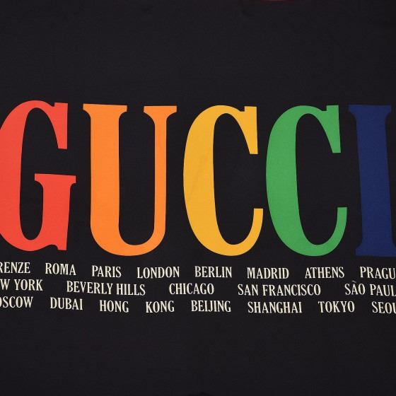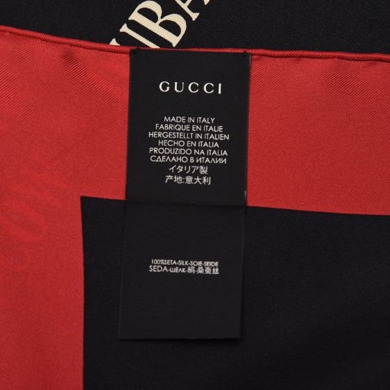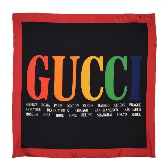Black scarf is crafted of 100% silk and features a rainbow Gucci logo with various travel destinations printed in white on a black background, with a red border.