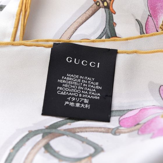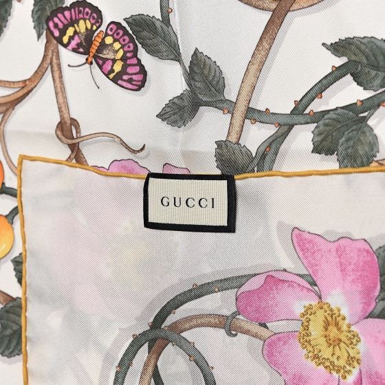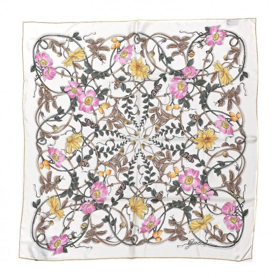 White scarf is crafted of 100% silk and features an ivory background with a multicolored floral overlay.
