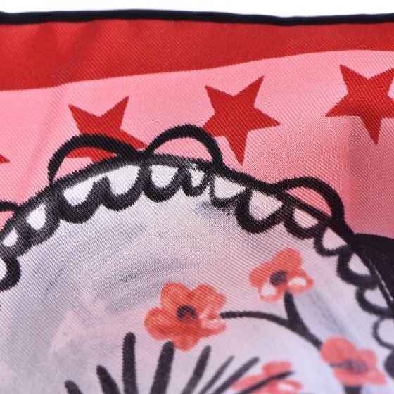 Scarf features a snake in a garden motif with a black background that has pink trim and red stars. This is an iconic scarf with one of a kind look, from Gucci!