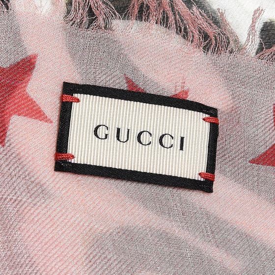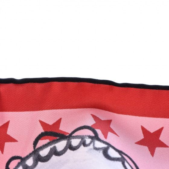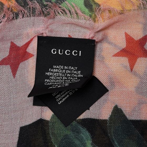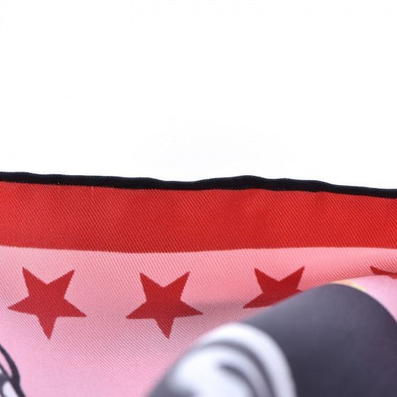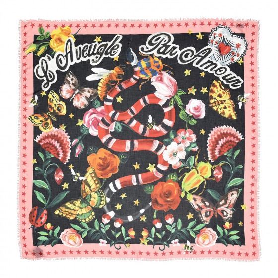 Scarf features a snake in a garden motif with a black background that has pink trim and red stars. This is an iconic scarf with one of a kind look, from Gucci!