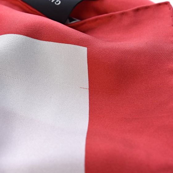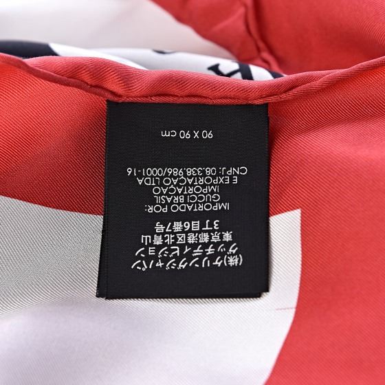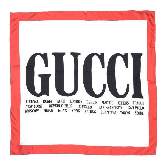 This scarf is crafted of 100% silk, and features a black Gucci logo with various travel destinations printed in black on a white background, with a red border.