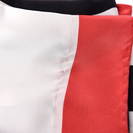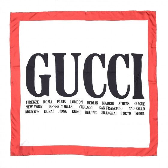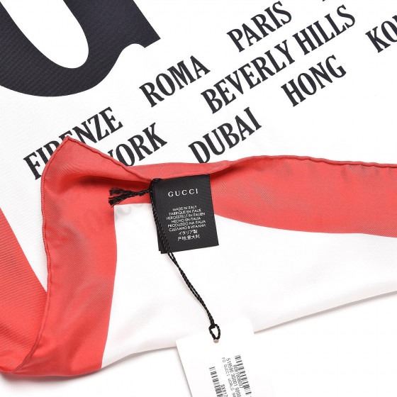 GUCCI Silk 80s Logo Scarf in Black / Red is crafted of 100% silk and features a black Gucci logo with various travel destinations printed on a white background with a bold red border.
