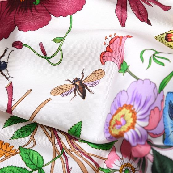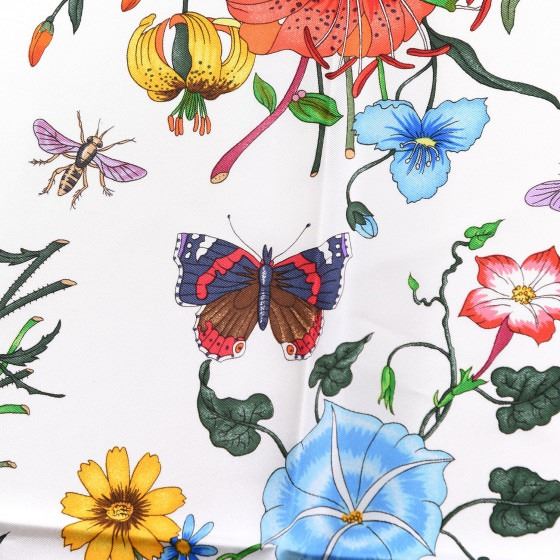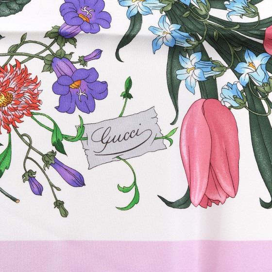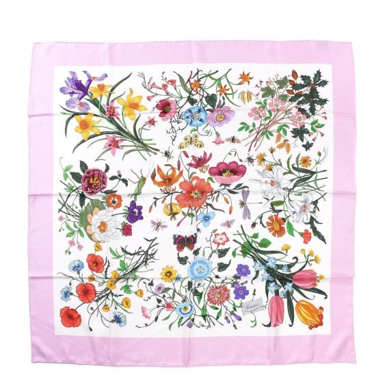 White / Pink scarf is crafted of silk and features a beautiful combination of bright colorful flowers on a white background with a pink border.