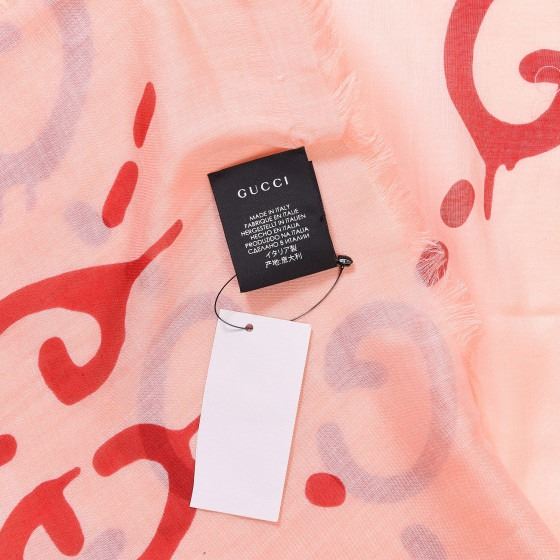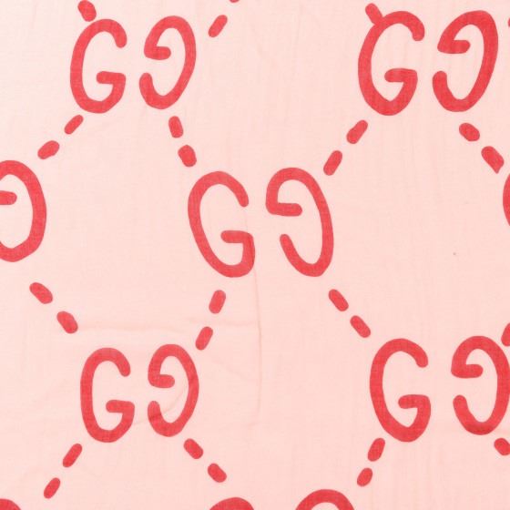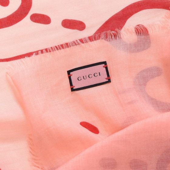 Violet Roseate scarf is crafted of 85% modal and 15% silk. It features a beautiful combination of red GG monogram on a light pink background with a fringe border.
