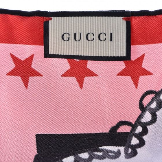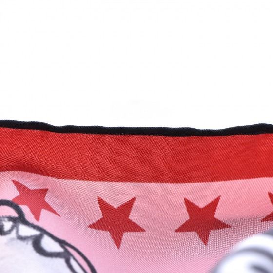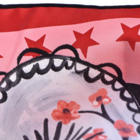 Black scarf is made of 100% silk. It features a snake in a garden motif with a black background that has pink trim and red stars.