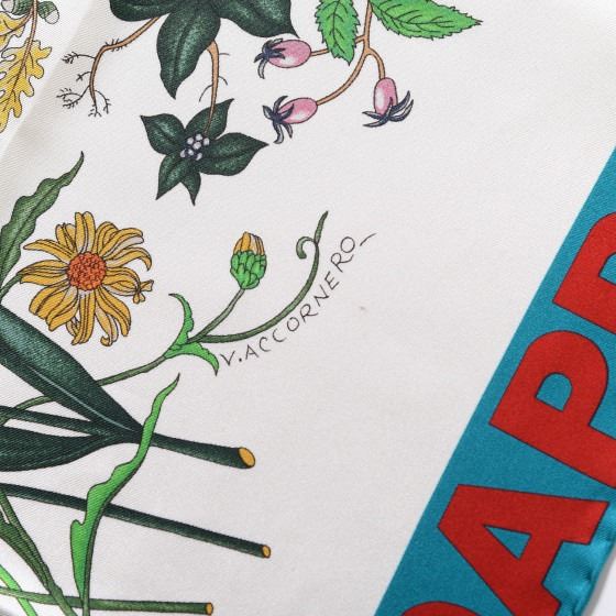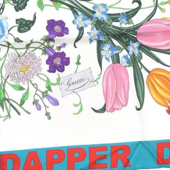 Ivory / Sky Blue scarf crafted with 100% silk and features a vibrantly colored floral motif on an ivory background with a red Dapper Dan logo printed on the blue border.