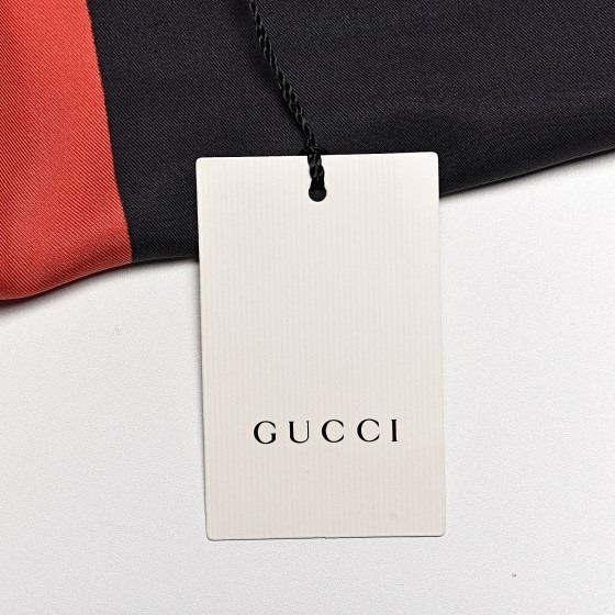 Red 100% silk scarf features a diamond logo with a red background.