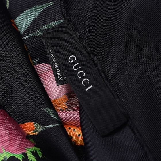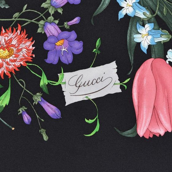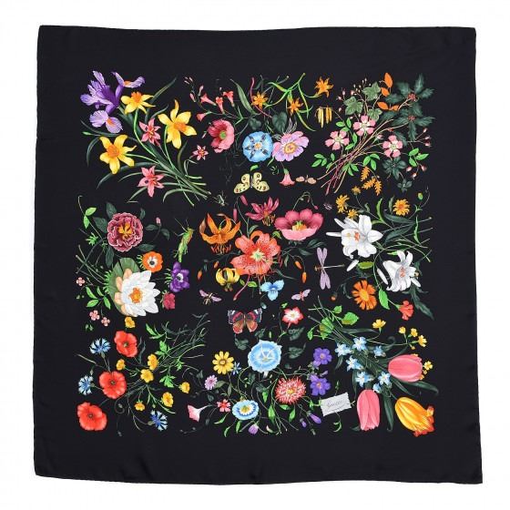 Black scarf is crafted in silk that features a beautiful combination of bright colorful flowers with a black background.