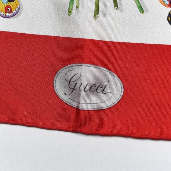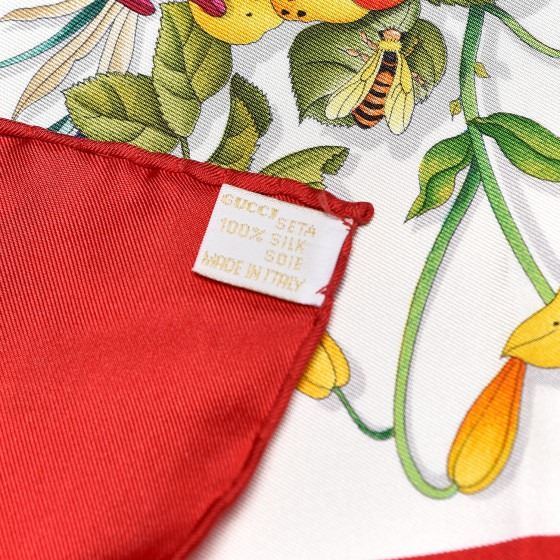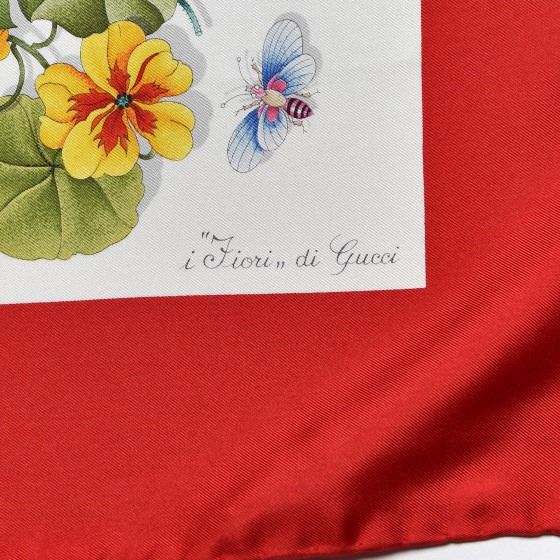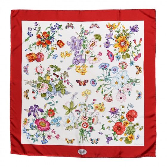 Red scarf is 100% silk and features a vibrantly colored floral overlay on a beige background with a red border.