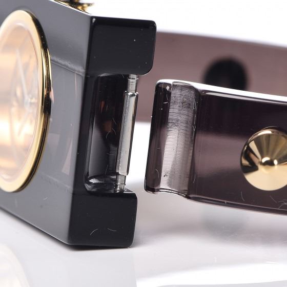 Black watch is crafted of stainless steel that has been plated in 18 karat yellow gold, and black plexiglass. It features a skeleton dial, a gold studded bracelet, and a gold stud crown.