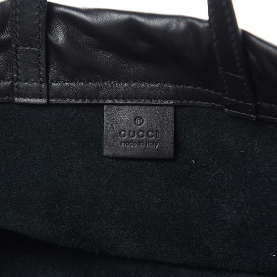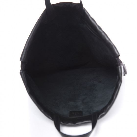 Shoulder bag features black leather top handles and black drawstrings. The side cording gathers around the top to cinch the backpack closed and opens to a spacious black suede interior.