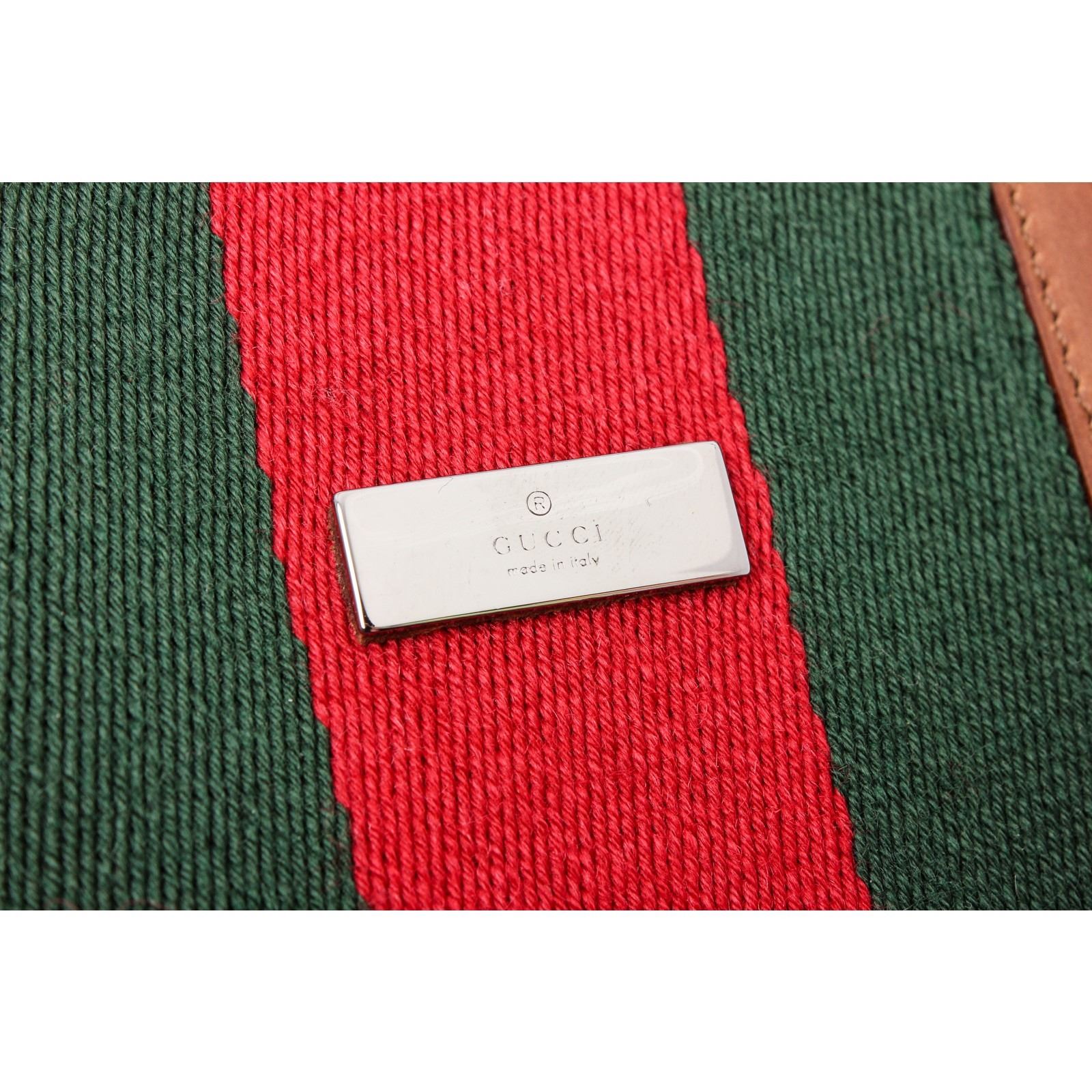 Brown suede and leather Gucci Web tote with silver-tone hardware, brown leather trim, dual rolled top handles, green and red Web panel and logo hardware at front face, chocolate GG canvas lining, single zip pocket at interior wall and zip closure at top.