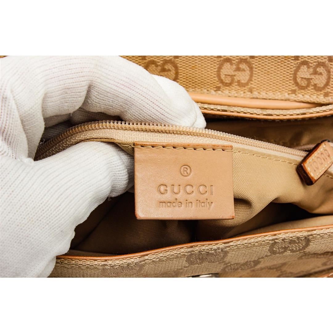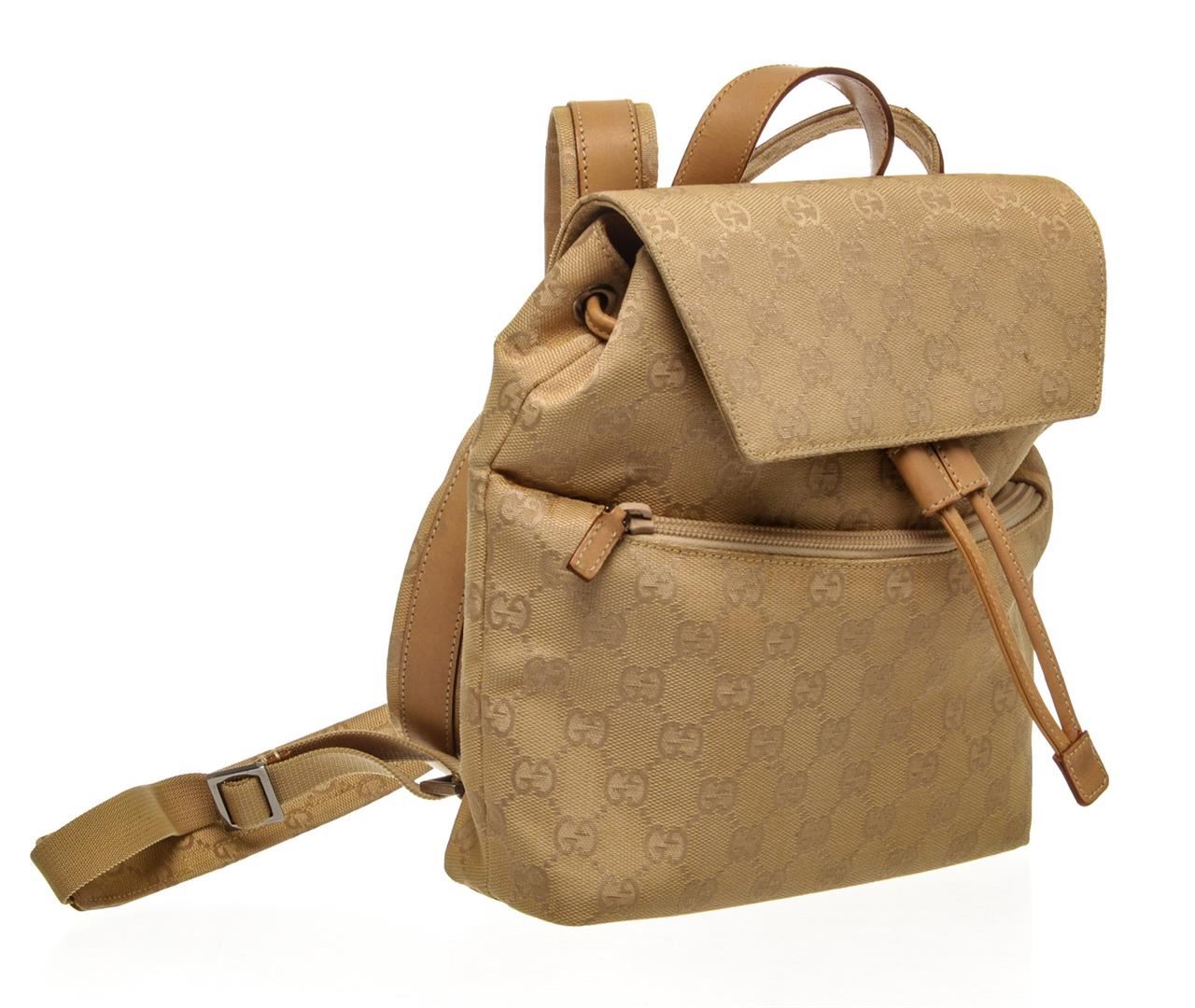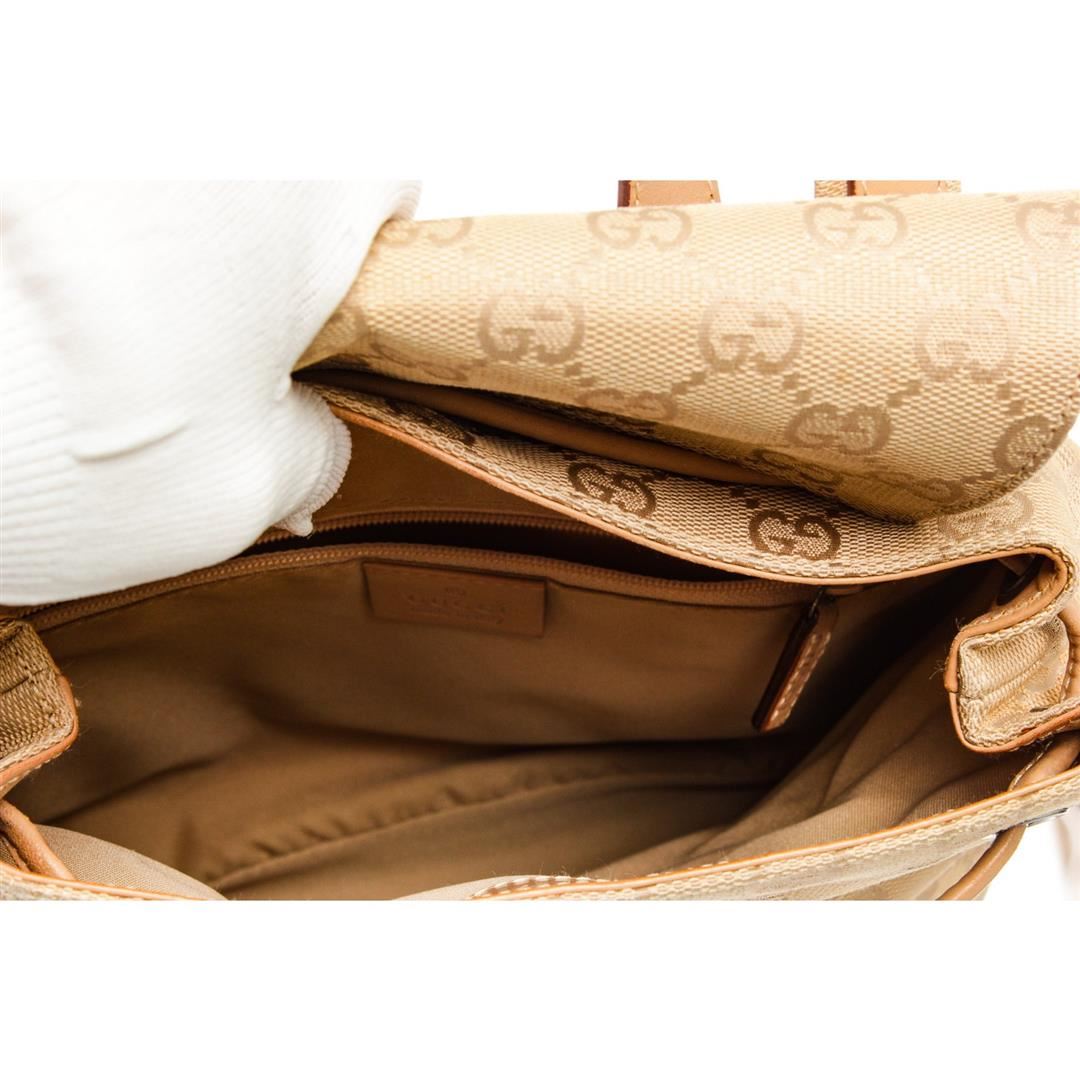 Tan beige GG canvas Gucci mini backpack with silver-tone hardware,leather trim, dual flat shoulder straps featuring adjustable buckles, single exterior zip pocket, tan woven interior lining, single interior zip pocket, drawstring closure at top and additional magnetic snap closure at front flap underside. Authentic.