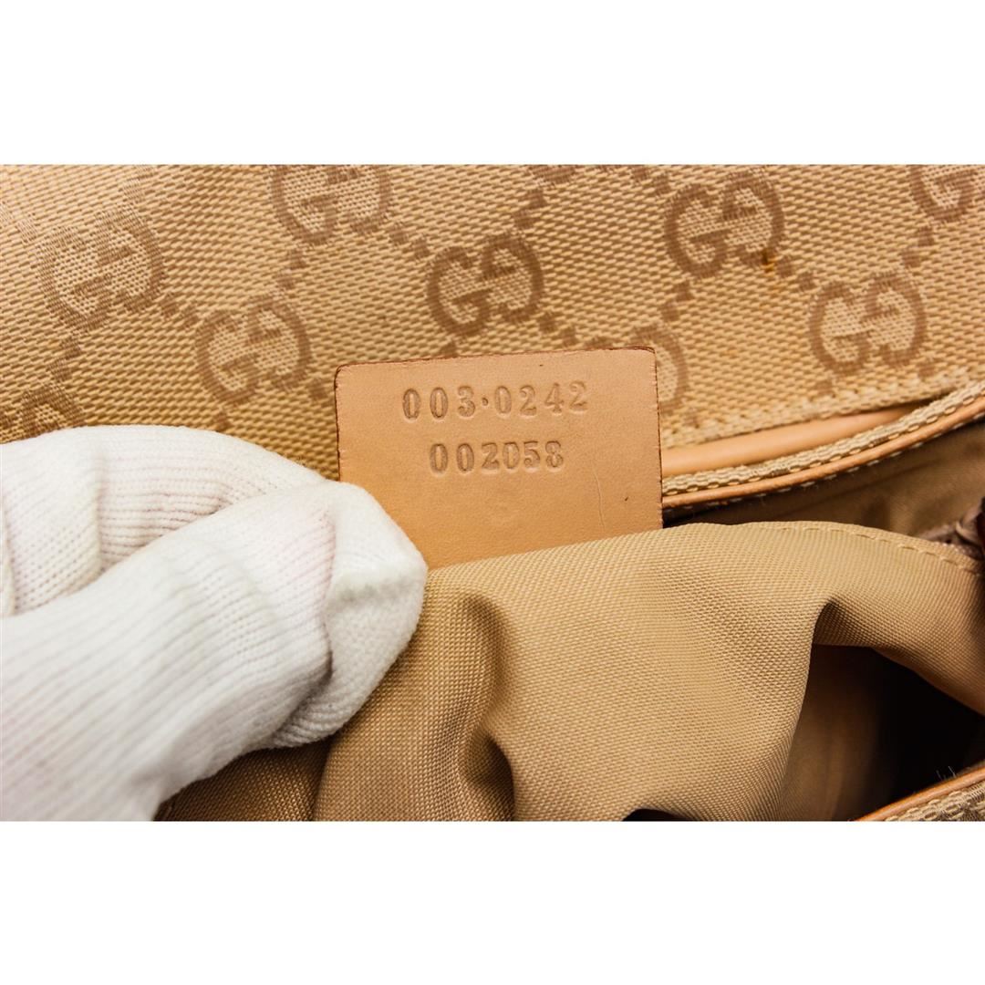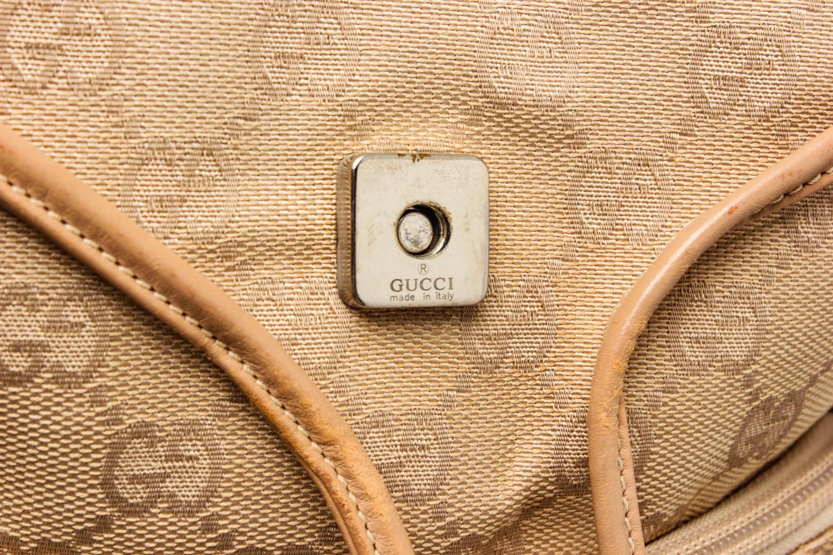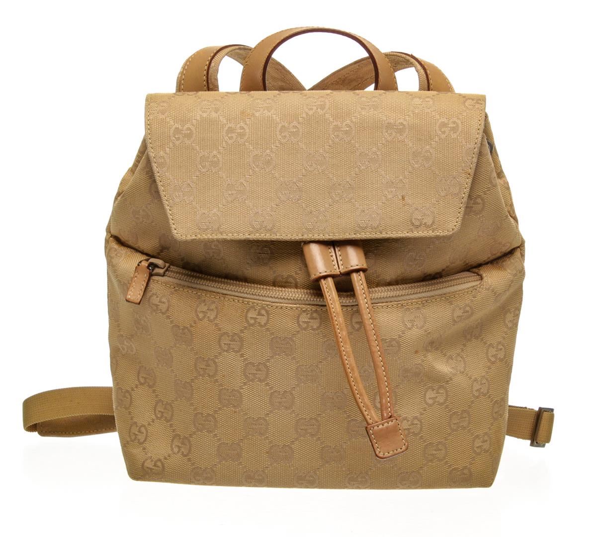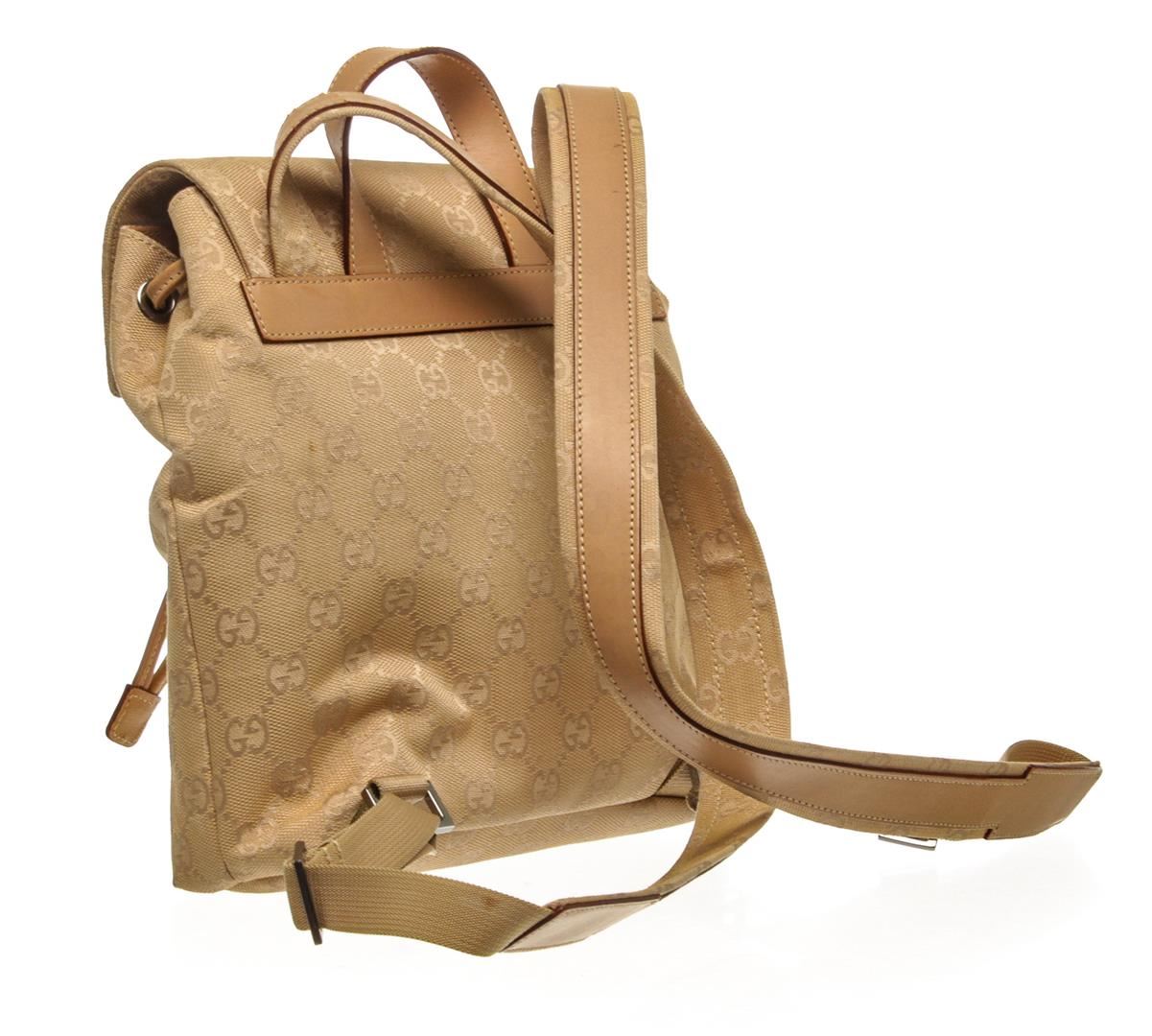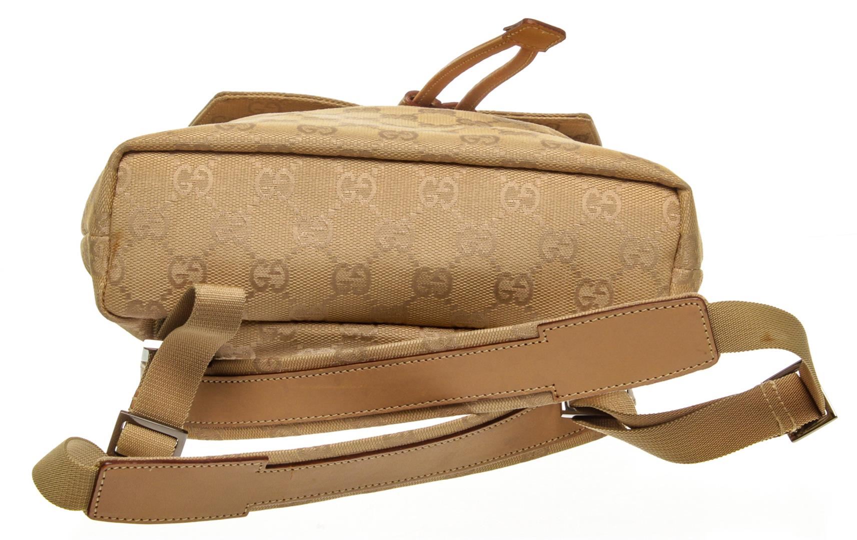 Tan beige GG canvas Gucci mini backpack with silver-tone hardware,leather trim, dual flat shoulder straps featuring adjustable buckles, single exterior zip pocket, tan woven interior lining, single interior zip pocket, drawstring closure at top and additional magnetic snap closure at front flap underside. Authentic.