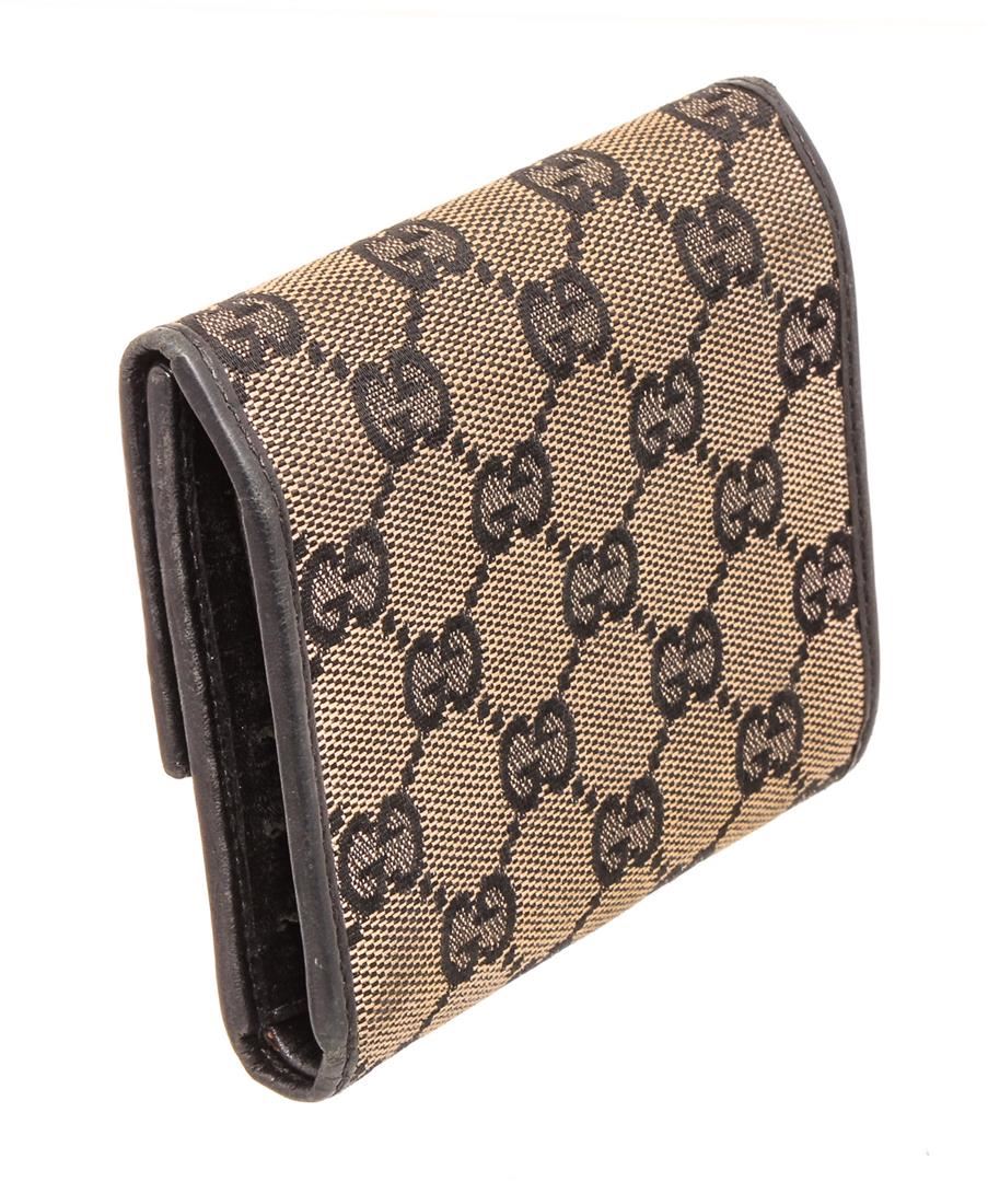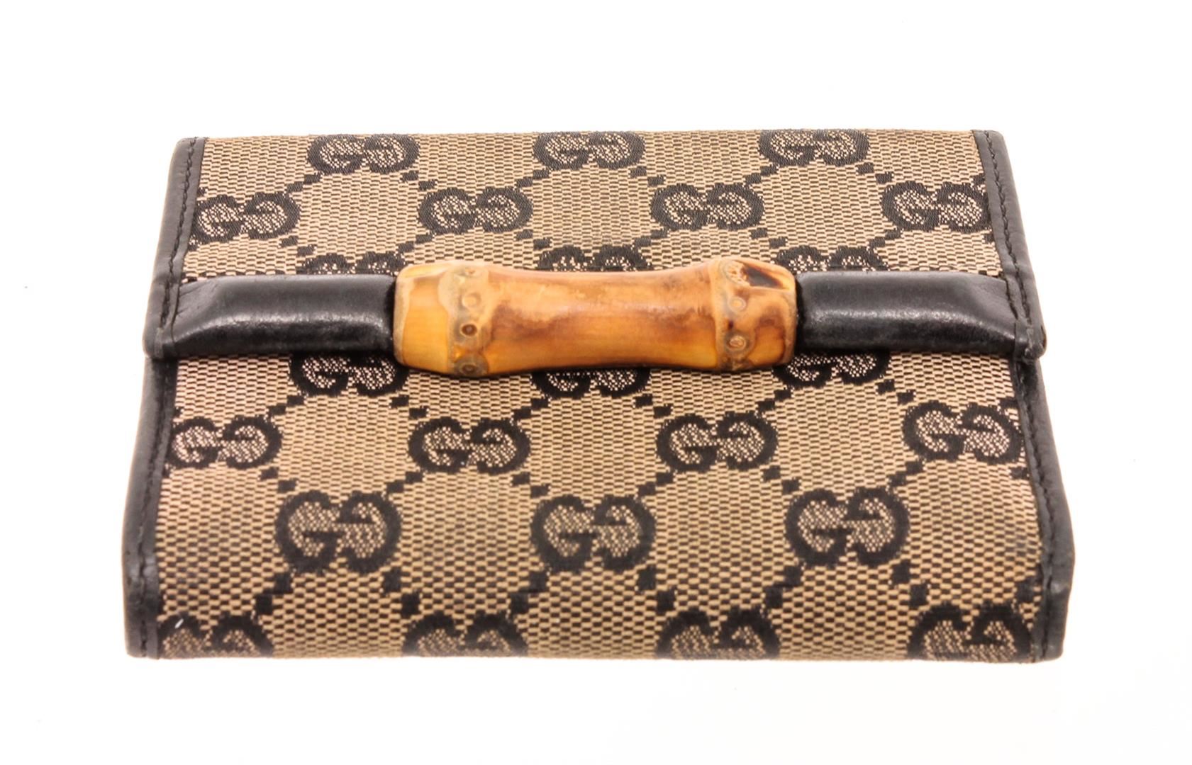 Gucci tan canvas bamboo compact wallet with black leather trim, black leather interior lining, five card slots, one coin pouch with snap closure, bill compartment at top and overall snap closure featuring bamboo accent at front flap.