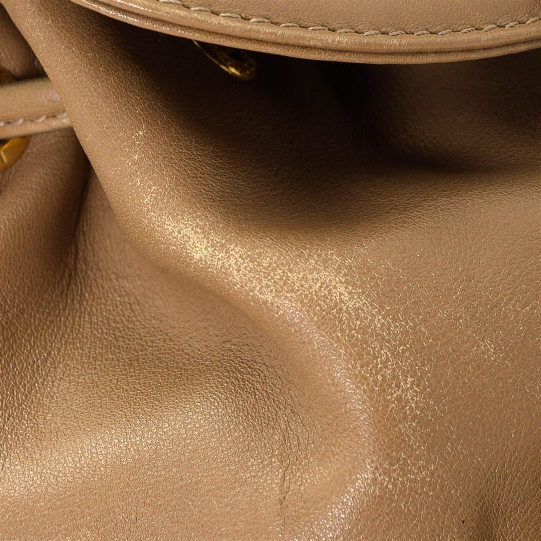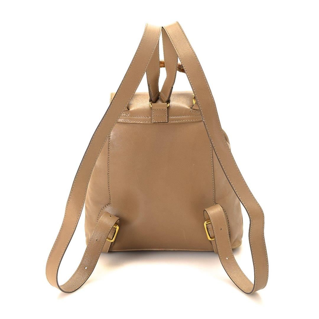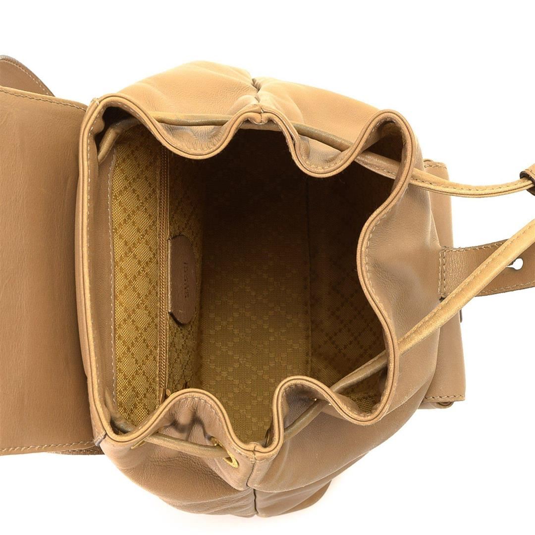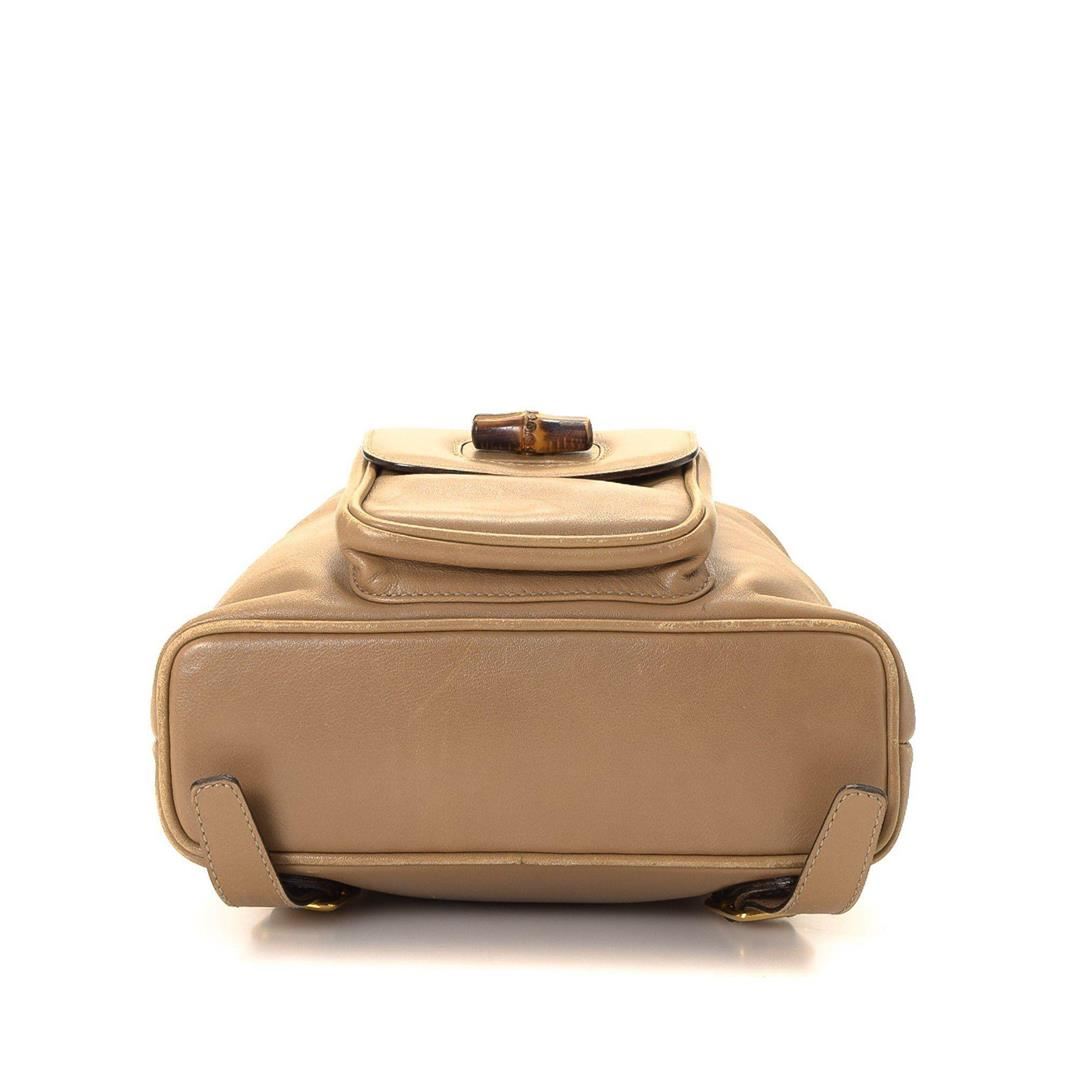 Gucci Tan Mini Leather Bamboo Backpack with gold-tone hardware, dual flat shoulder straps buckle adjustments, single bamboo top handle, single flap pocket bamboo turn-lock closure at front, tan woven lining, single zip pocket at interior wall and drawstring closure at top with closure at front flap. Measurements: Length: 2.75 in / 7 cm Width: 8.25 in / 21 cm 9 in / 23 cm Condition: Pre-Owned Good overall, please see photographs for detail.