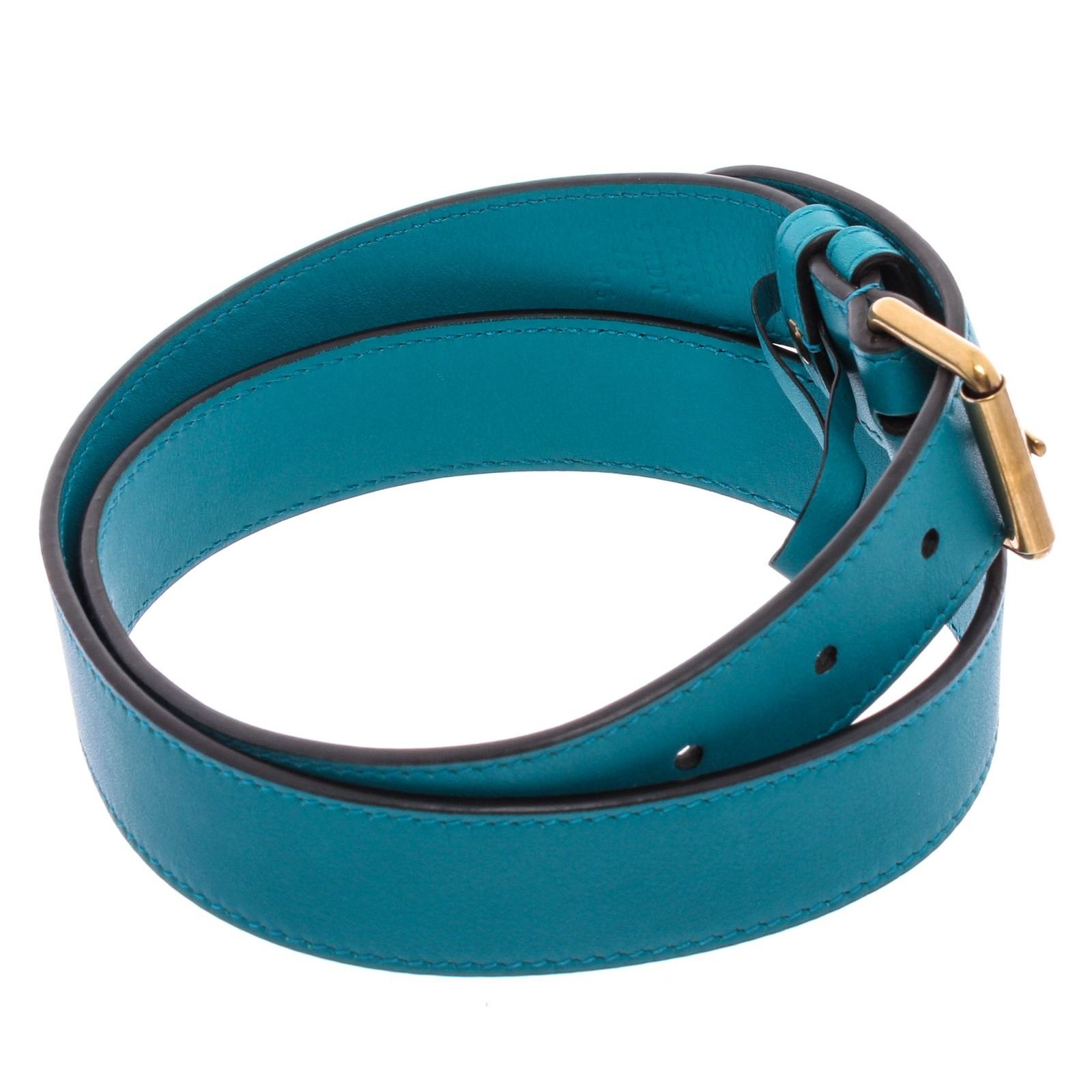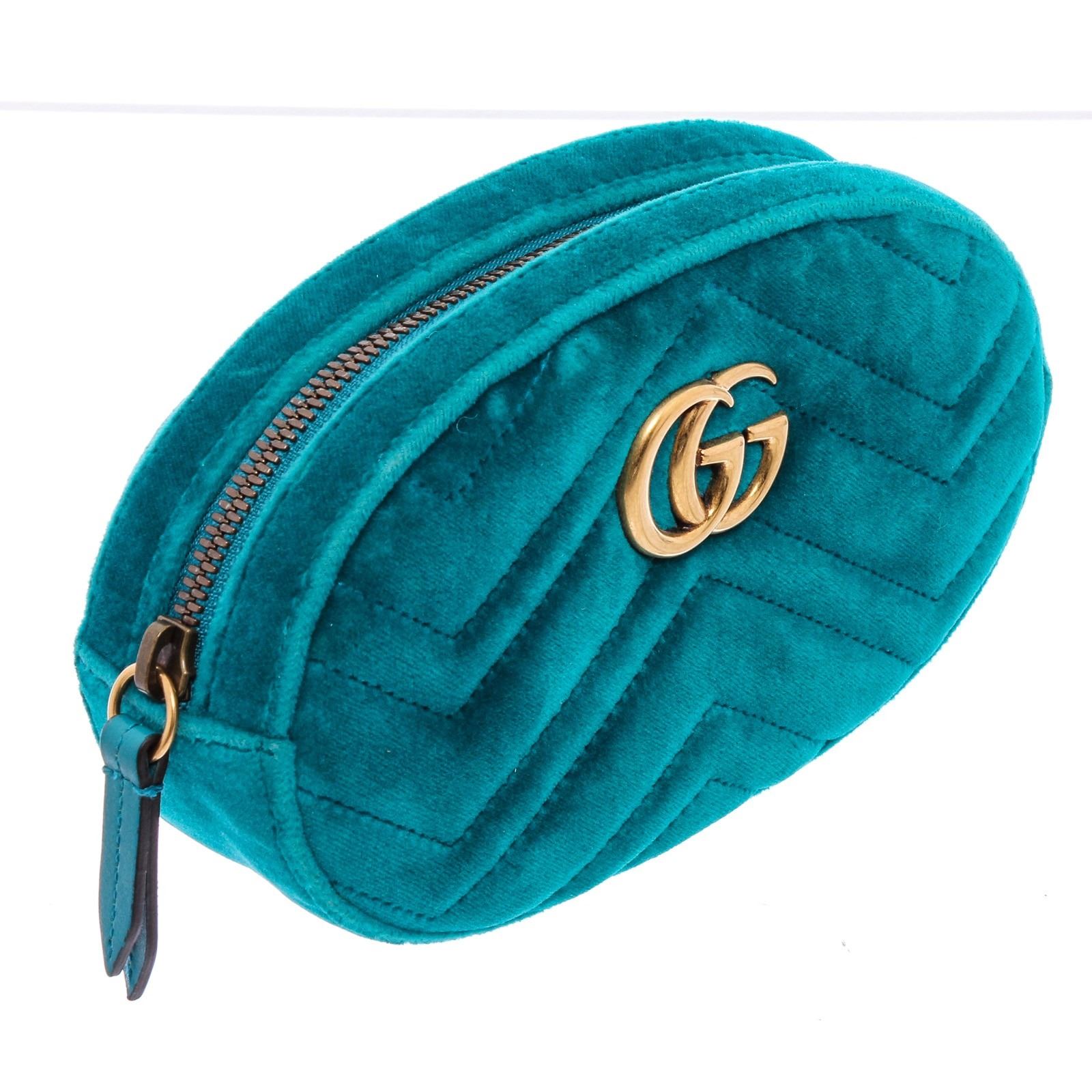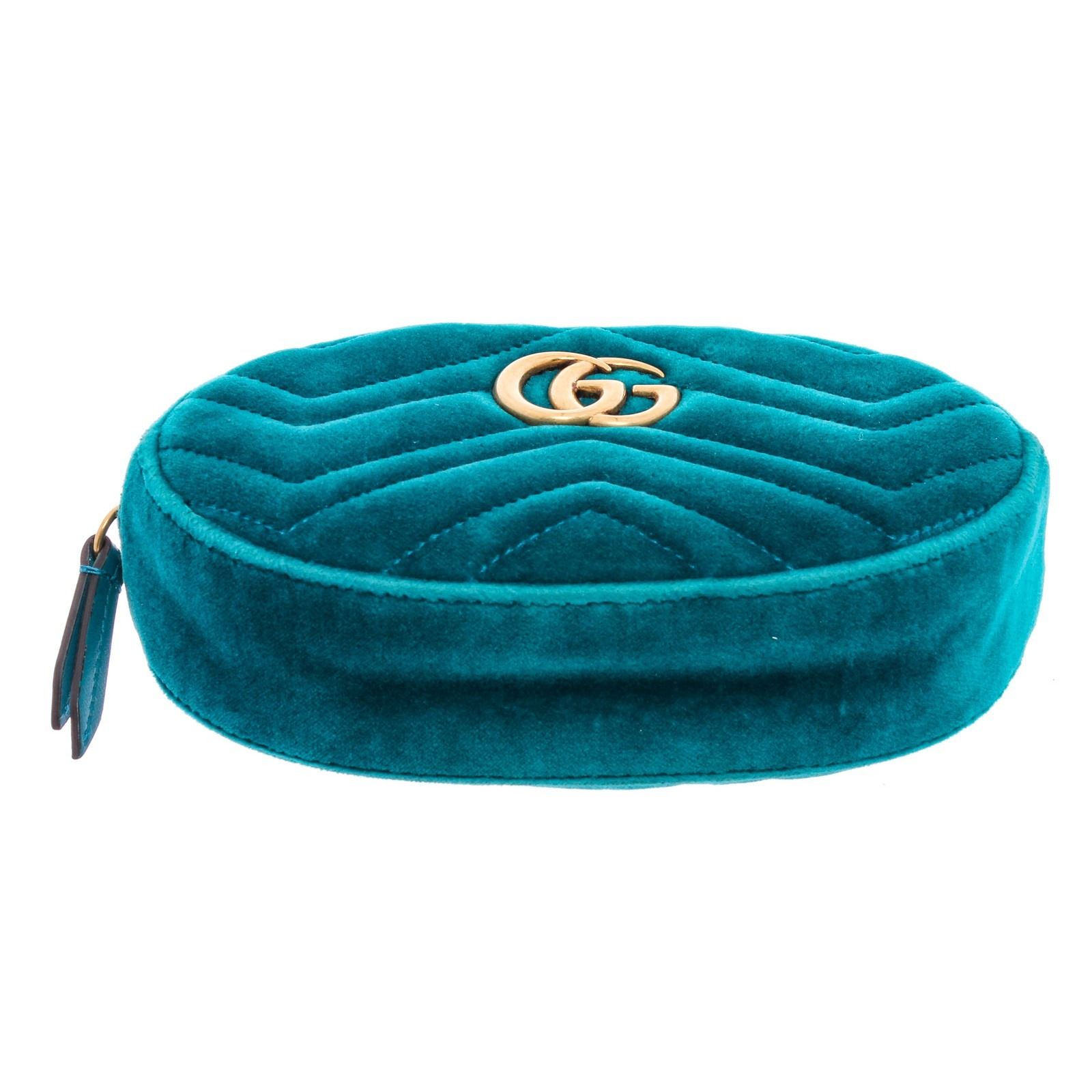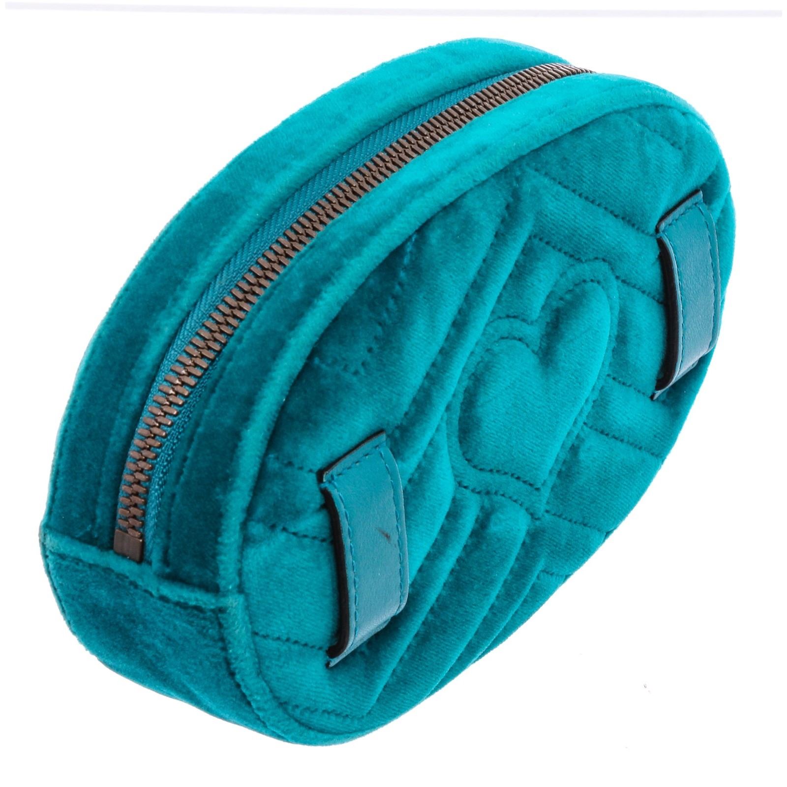 This Gucci Marmont belt bag is crafted of turquoise blue chevron stitched velvet. This bag is an oval shape with a leather belt that can be worn as a waist bag. It features an aged gold GG logo on the front and a stitched heart shape on the back of the bag with an adjustable belt closure. It opens to a pink satin interior with zippered top closure.