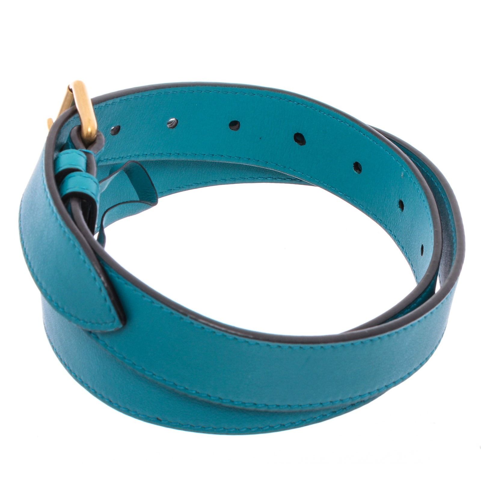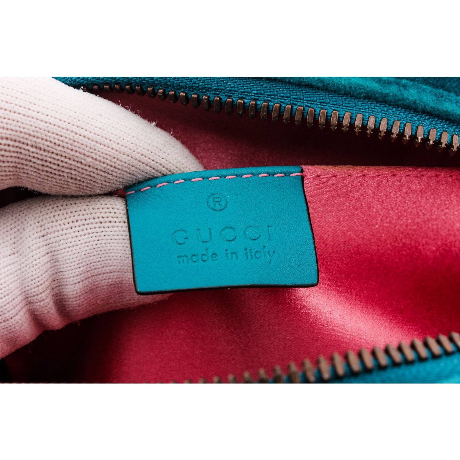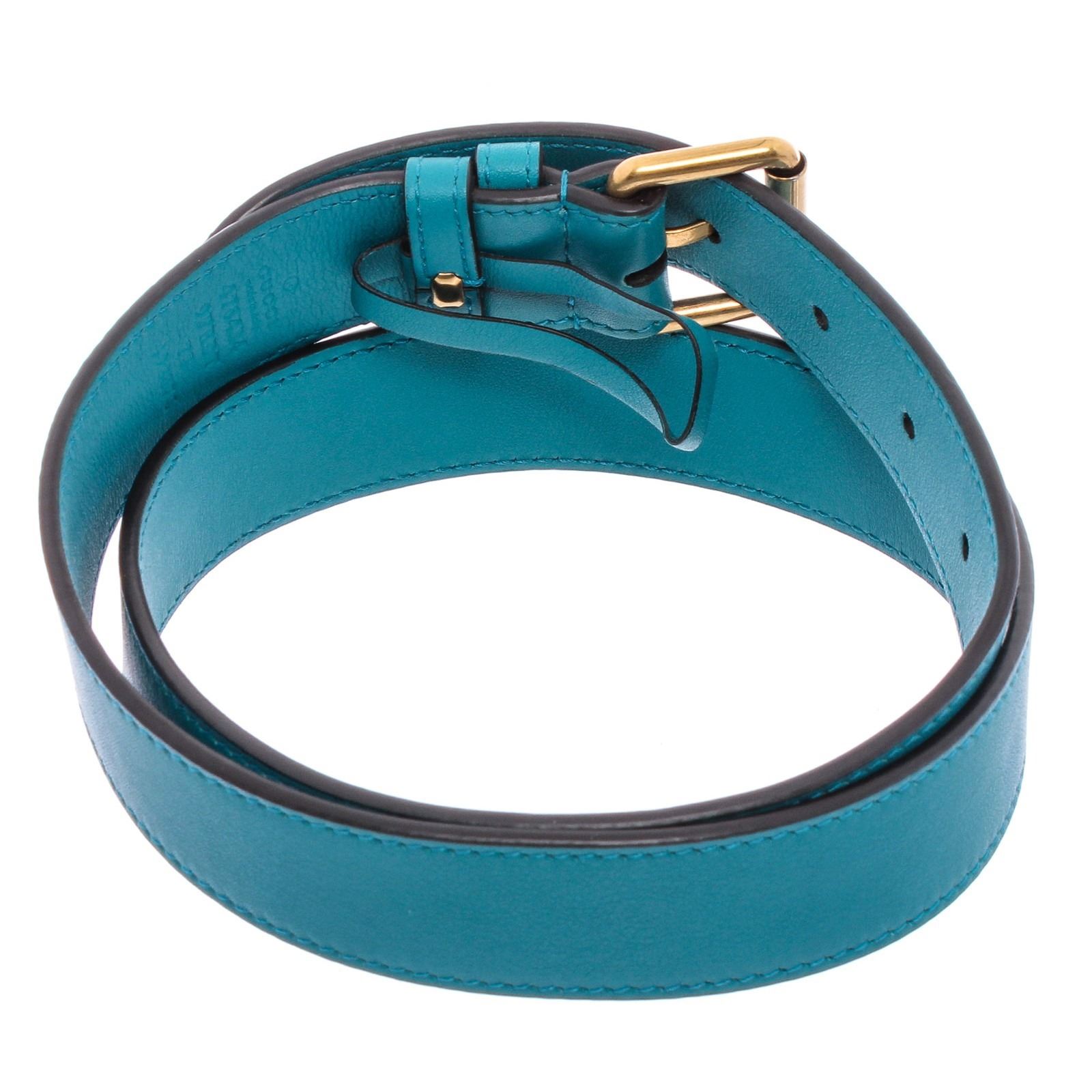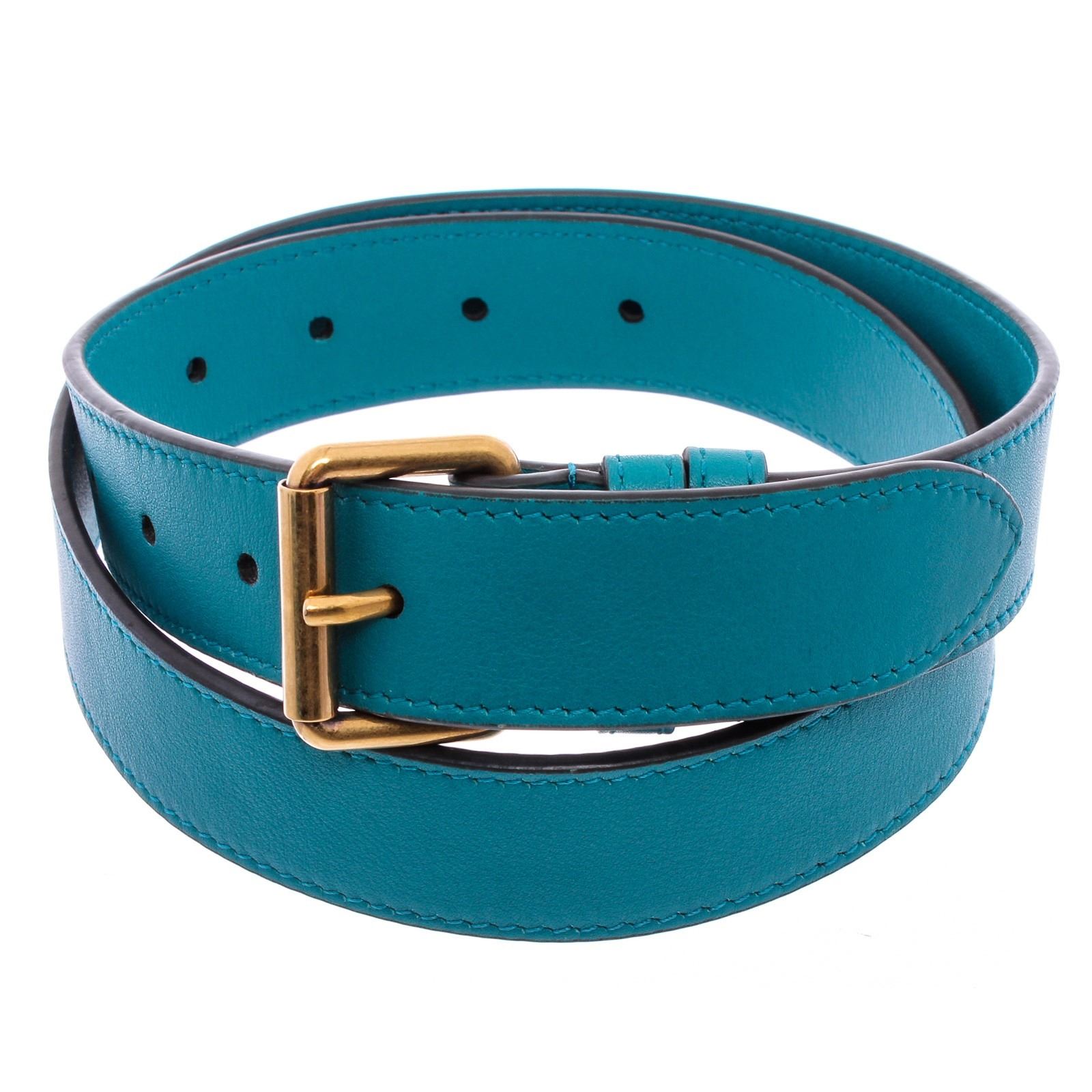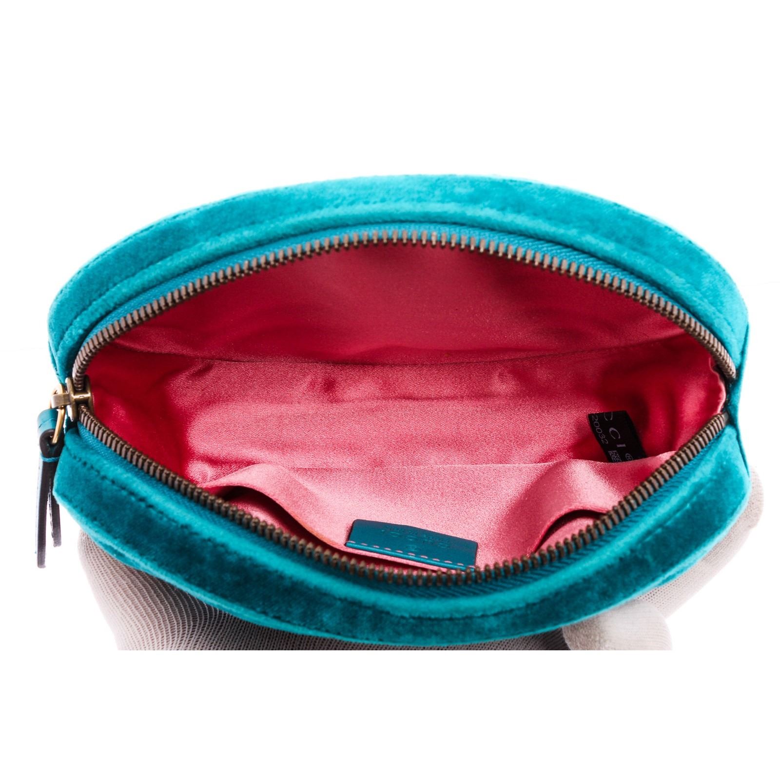 This Gucci Marmont belt bag is crafted of turquoise blue chevron stitched velvet. This bag is an oval shape with a leather belt that can be worn as a waist bag. It features an aged gold GG logo on the front and a stitched heart shape on the back of the bag with an adjustable belt closure. It opens to a pink satin interior with zippered top closure.