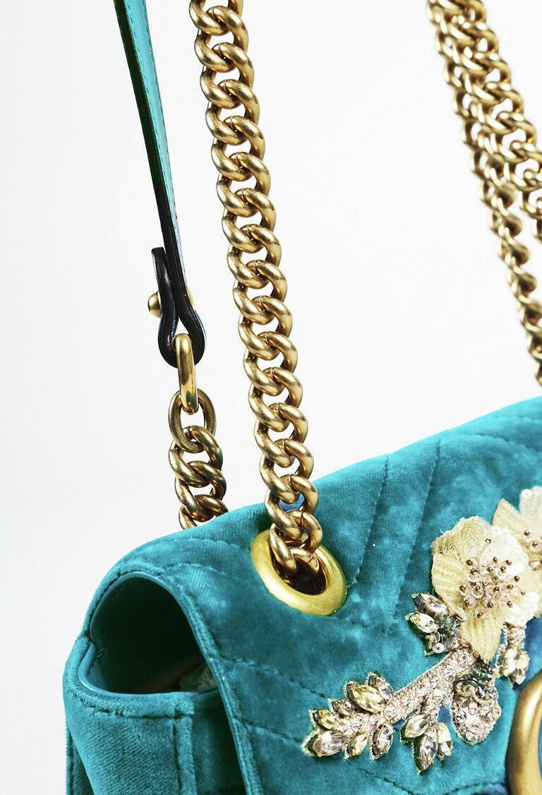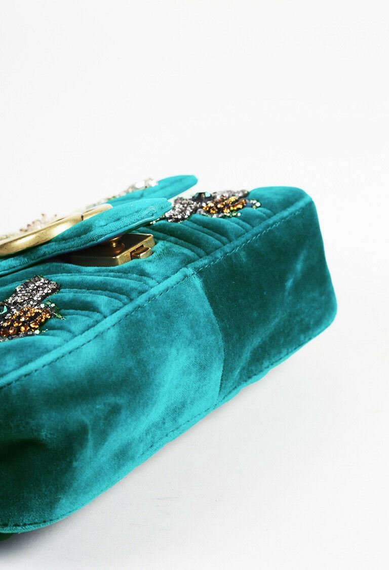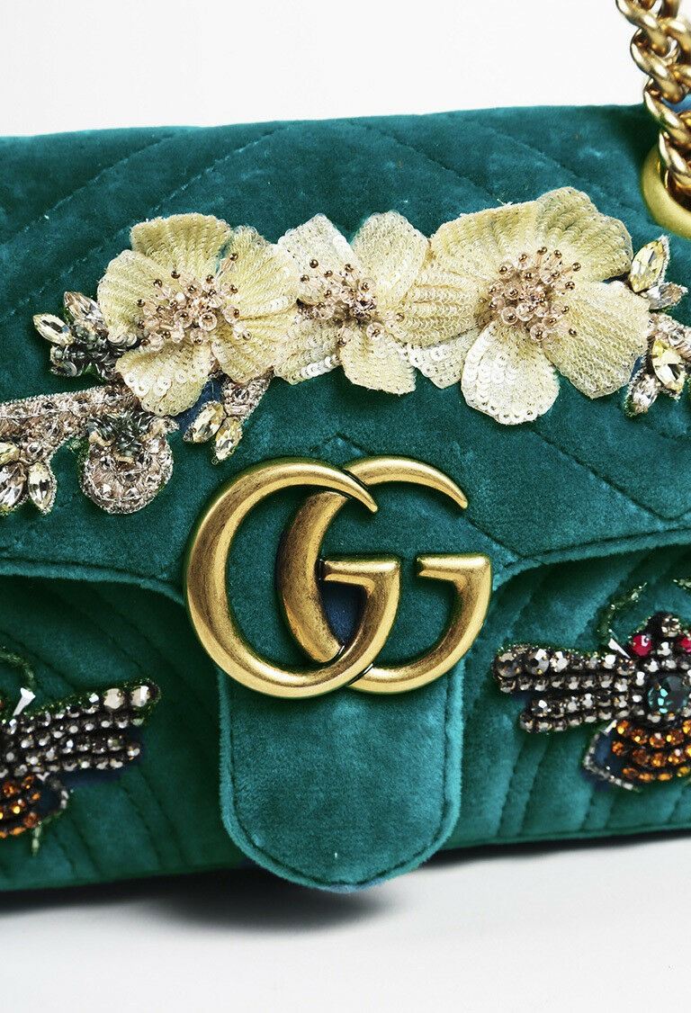 Gucci Matelasse velvet mini "Marmont" bag features gold tone hardware, beaded flower accents, interlocking 'GG' logo, adjustable strap, front flap with a push lock closure, and a lined interior with pockets.