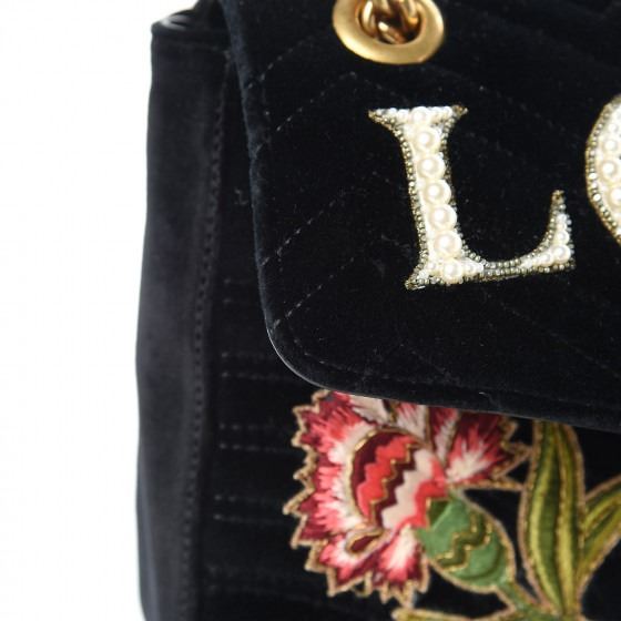 This shoulder bag is crafted of soft velvet in a black. This bag features eye-catching embroidery lined with faux pearls spelling the word LOVED with two flowers and a long aged-gold chain-link shoulder strap with a leather shoulder pad. The front crossover flap features an interlocking GG logo that opens to a pink satin interior with a zipper and patch pocket.