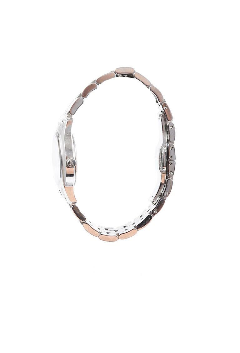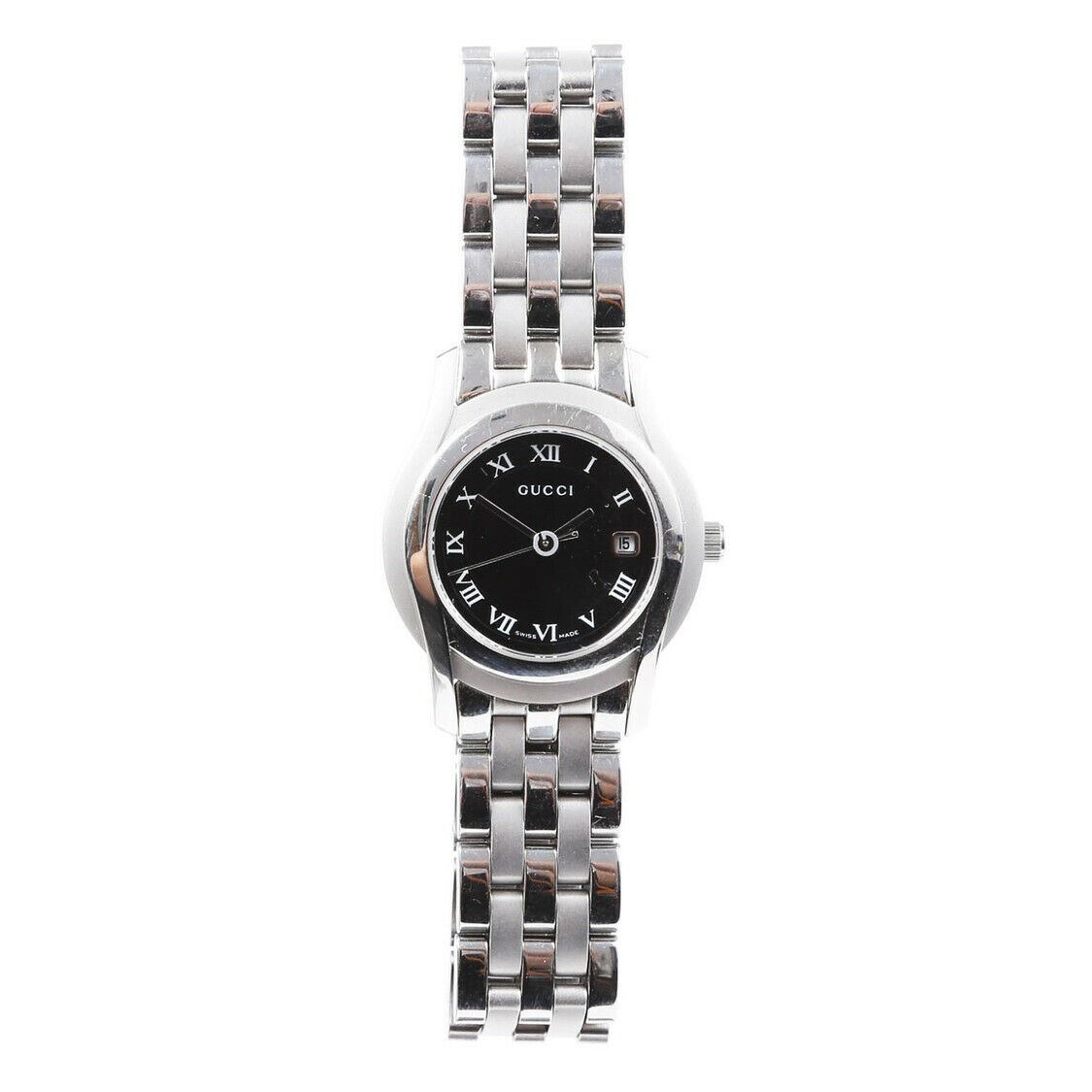 Gucci 5500L Series stainless steel watch is water resistant and features quartz movement, Roman numerals, date complication, and a double deployment closure.
